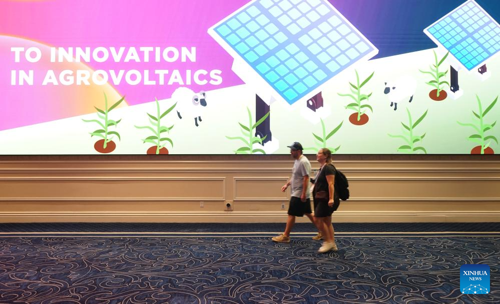 People visit the RE+ expo in Las Vegas, the United States, Sept. 8, 2025. The RE+ expo, North America's largest clean energy gathering, kicked off on Monday in Las Vegas, the U.S. state of Nevada, bringing together industry leaders and experts to chart the future of sustainable power. The expo showcases cutting-edge products, technologies and solutions across a wide range of clean energy sectors, including solar, wind, hydrogen, microgrids, energy storage, as well as electric vehicle charging and infrastructure. (Photo by Zeng Hui/Xinhua)