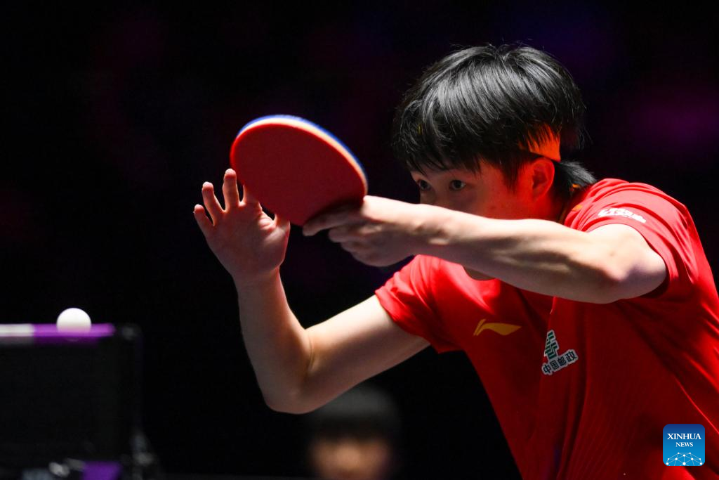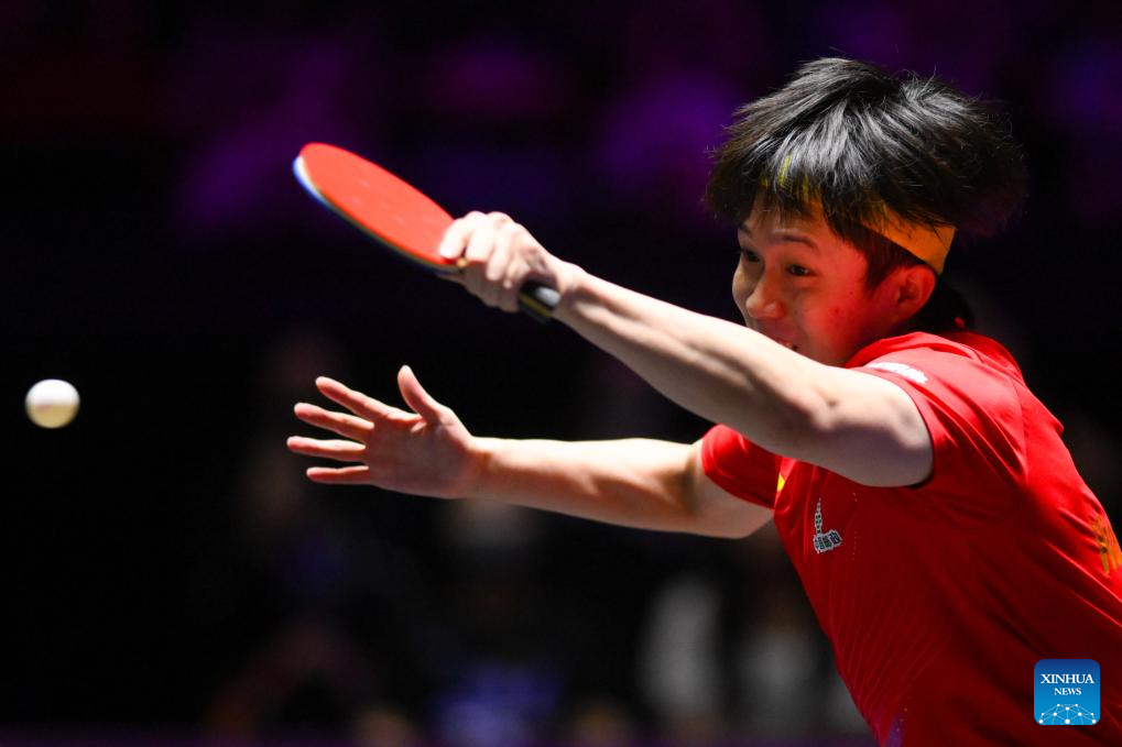 Wang Chuqin hits a return during the men's singles round of 32 match between Wang Chuqin of China and Matsushima Sora of Japan at the 2025 World Table Tennis (WTT) Champions Macao in Macao, south China, Sept. 9, 2025. (Xinhua/Cheong Kam Ka)