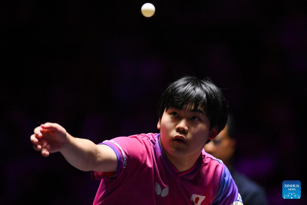 Matsushima Sora serves during the men's singles round of 32 match between Wang Chuqin of China and Matsushima Sora of Japan at the 2025 World Table Tennis (WTT) Champions Macao in Macao, south China, Sept. 9, 2025. (Xinhua/Cheong Kam Ka)