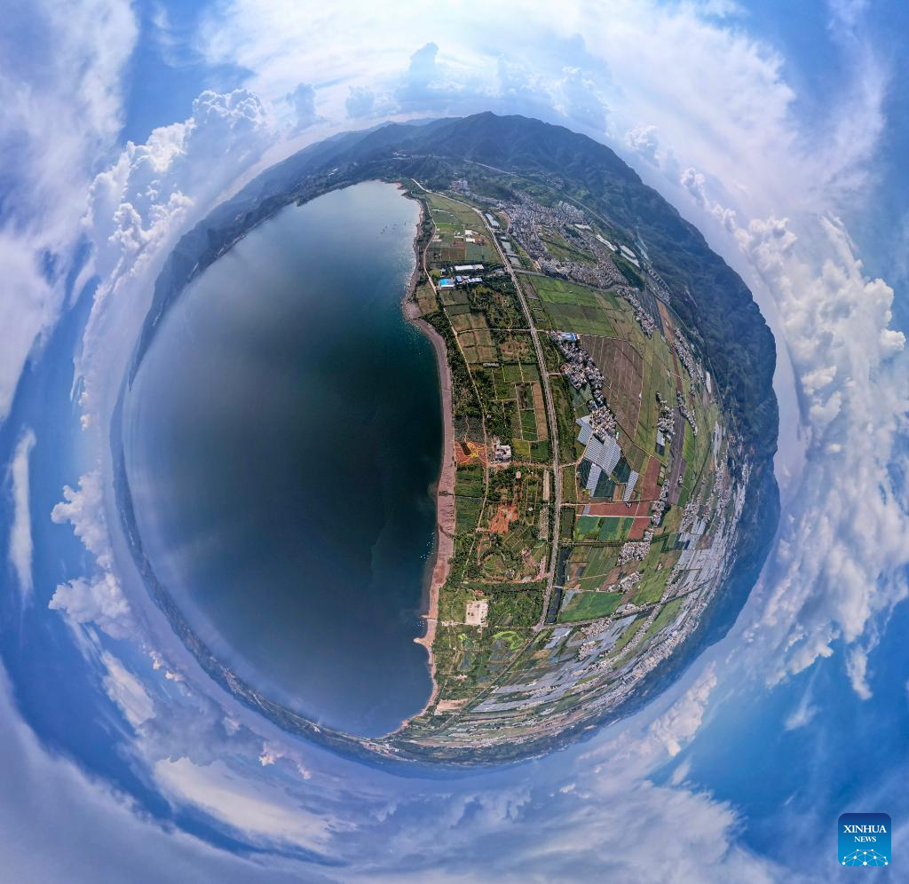 This spherical panorama taken with a drone on Sept. 8, 2025 shows a view of Fuxian Lake in Yuxi City, southwest China's Yunnan Province. (Xinhua/Chen Xinbo)