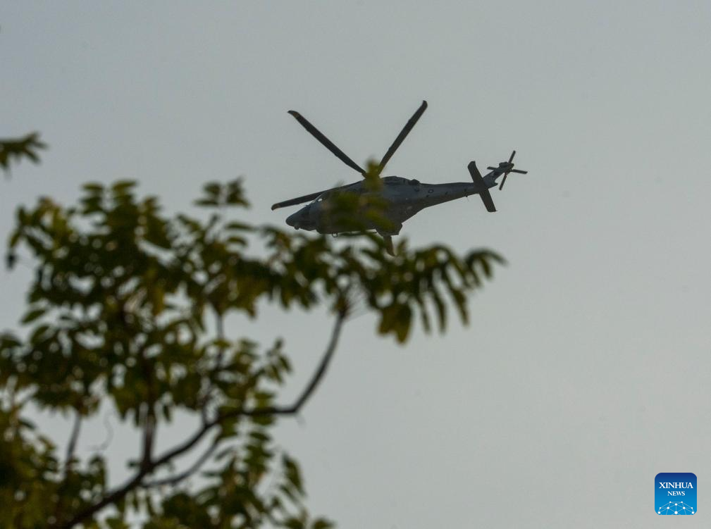 A helicopter is seen near the site of an Israeli airstrike in Doha, Qatar, Sept. 9, 2025. Israel launched an unprecedented airstrike in the Qatari capital of Doha on Tuesday, targeting a building used by senior Hamas officials in what Israeli authorities described as an attempt to assassinate leaders of the group. (Photo by Nikku/Xinhua)