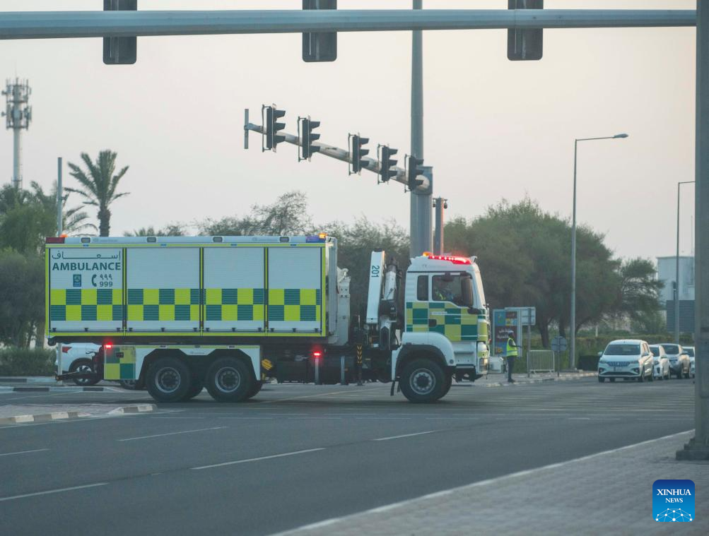 An ambulance is seen near the site of an Israeli airstrike in Doha, Qatar, Sept. 9, 2025. Israel launched an unprecedented airstrike in the Qatari capital of Doha on Tuesday, targeting a building used by senior Hamas officials in what Israeli authorities described as an attempt to assassinate leaders of the group. (Photo by Nikku/Xinhua)