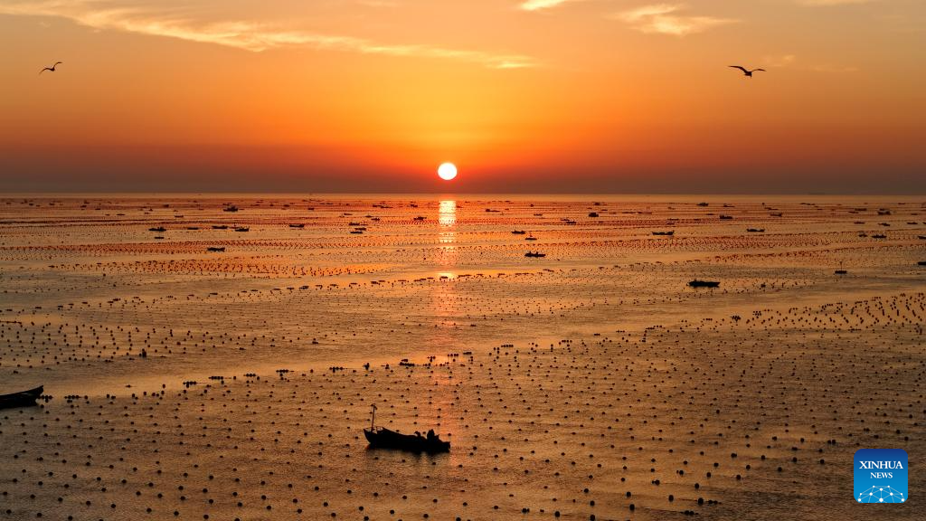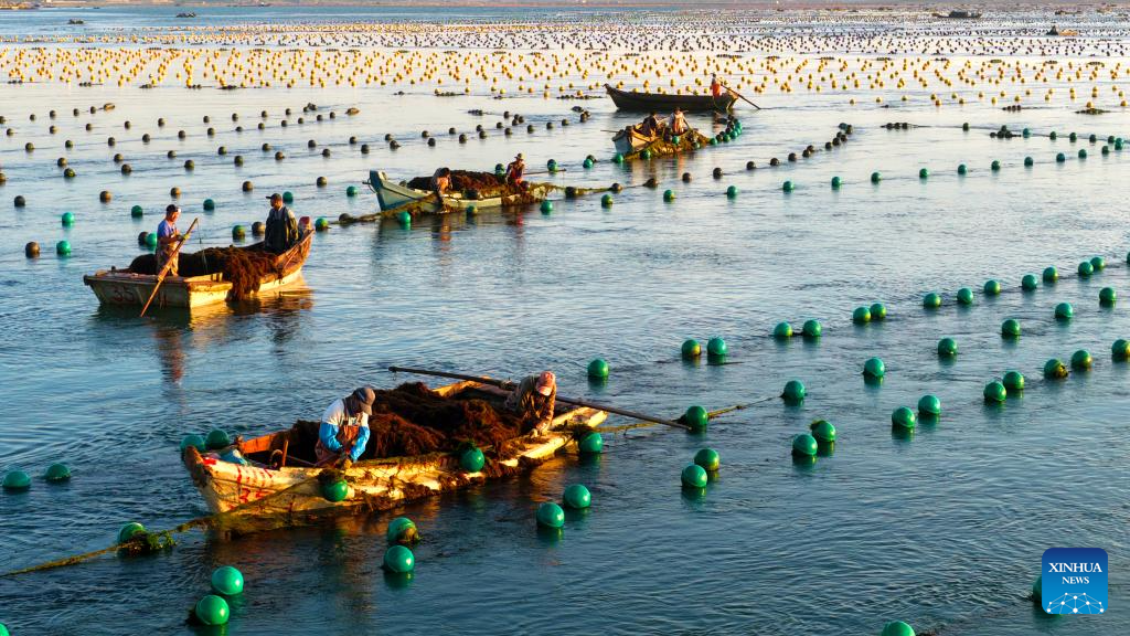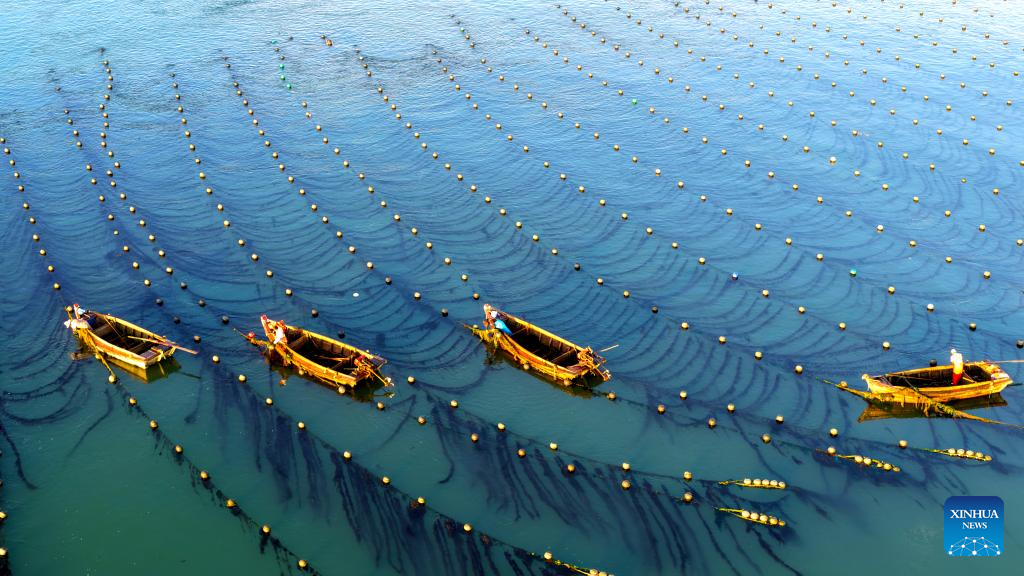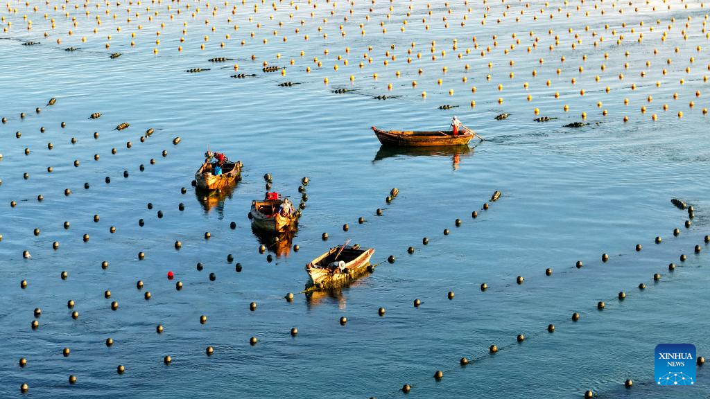 An aerial drone photo taken on Sept. 11, 2025 shows fishermen at work aboard their boats in a marine pasture in Rongcheng, east China's Shandong Province. (Photo by Yang Zhili/Xinhua)