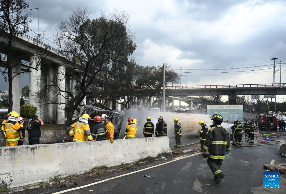 Photo taken on Sept. 10, 2025 shows the gas tanker truck explosion accident site in Mexico City, Mexico. Fifty-seven people were injured after a gas tanker truck exploded on Wednesday in Mexico City, with 19 of them in serious condition, local authorities said. (Str/Xinhua)