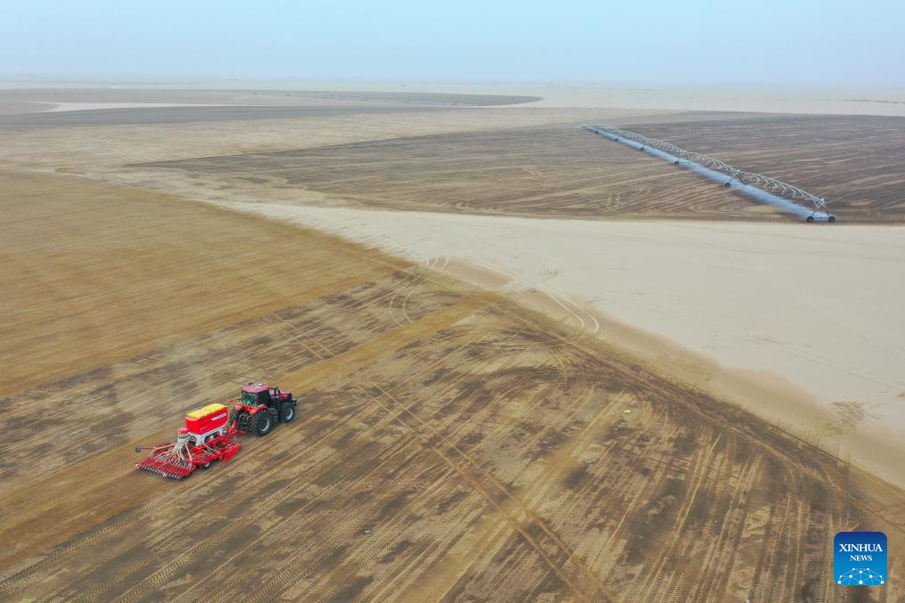 An aerial drone photo taken on Sept. 9, 2025 shows a farm machinery operator driving a machine to sow alfalfa at an alfalfa planting base in Cele County of Hotan Prefecture, northwest China's Xinjiang Uygur Autonomous Region. Alfalfa planting has provided stable forage supply for the local animal husbandry. Meanwhile, a "cooperative plus enterprise" development mode made it possible to establish a complete industrial chain of alfalfa planting, processing and sales in Hotan, which not only helped to build an ecological barrier, but also boosted income of farmers. (Xinhua/Ding Lei)