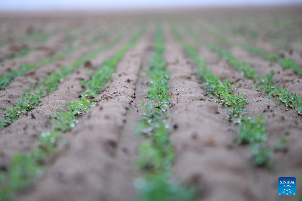 Alfalfa seedlings are pictured at an alfalfa planting base in Cele County of Hotan Prefecture, northwest China's Xinjiang Uygur Autonomous Region, on Sept. 9, 2025. Alfalfa planting has provided stable forage supply for the local animal husbandry. Meanwhile, a "cooperative plus enterprise" development mode made it possible to establish a complete industrial chain of alfalfa planting, processing and sales in Hotan, which not only helped to build an ecological barrier, but also boosted income of farmers. (Xinhua/Ding Lei)
