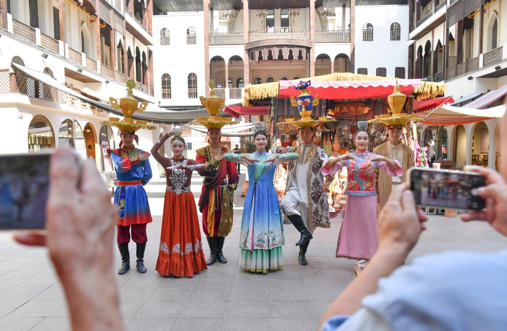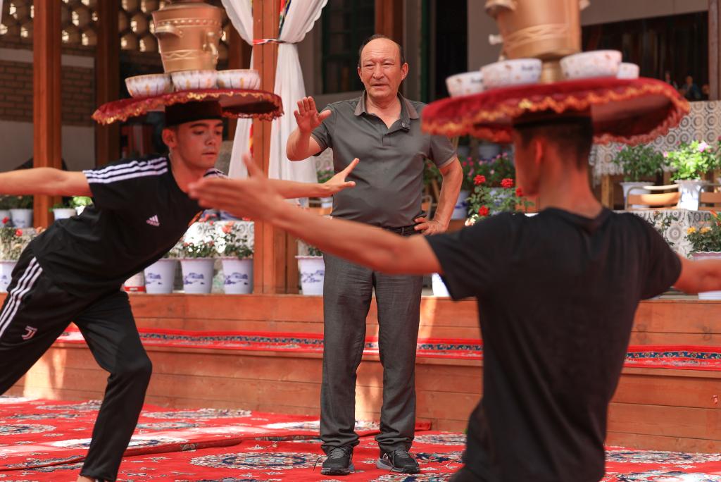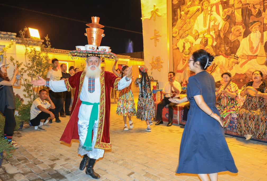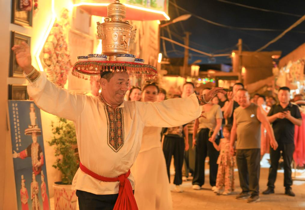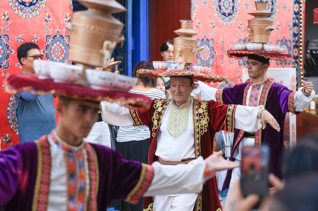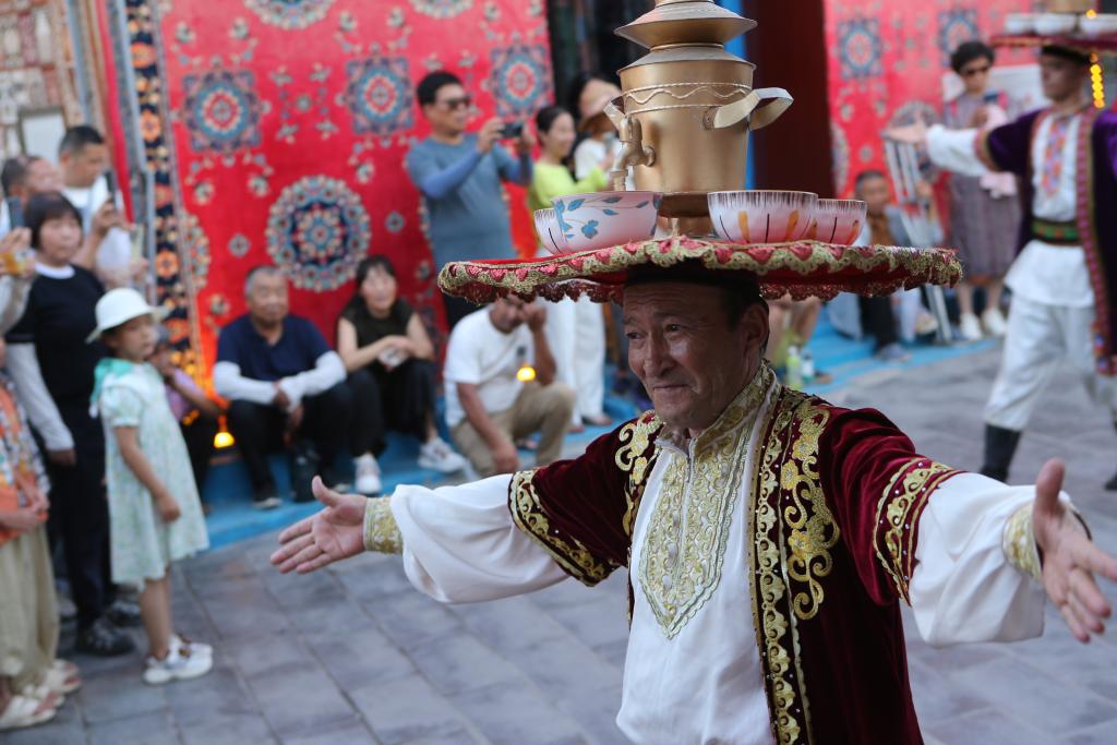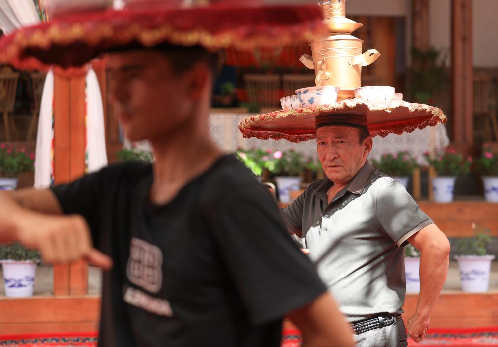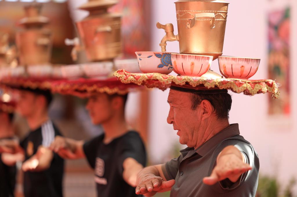 URUMQI, Sept. 11 (Xinhua) -- In the Qiuci Alley of Kuqa City, northwest China's Xinjiang Uygur Autonomous Region, Parhat Emin performs the Samawar (a Uygur term meaning "tea set") dance, a traditional Uygur greeting dance with a history dating back to the millennium-old ancient Qiuci State. His eyes shine brightly, and his smile is warm and welcoming. With a bronze pot and porcelain bowls balanced steadily on a plate over his head, his body spins smoothly, and his feet move as lightly as the wind. As he dances gracefully to the rhythm of traditional Uygur music, the surrounding audience burst into cheers from time to time.