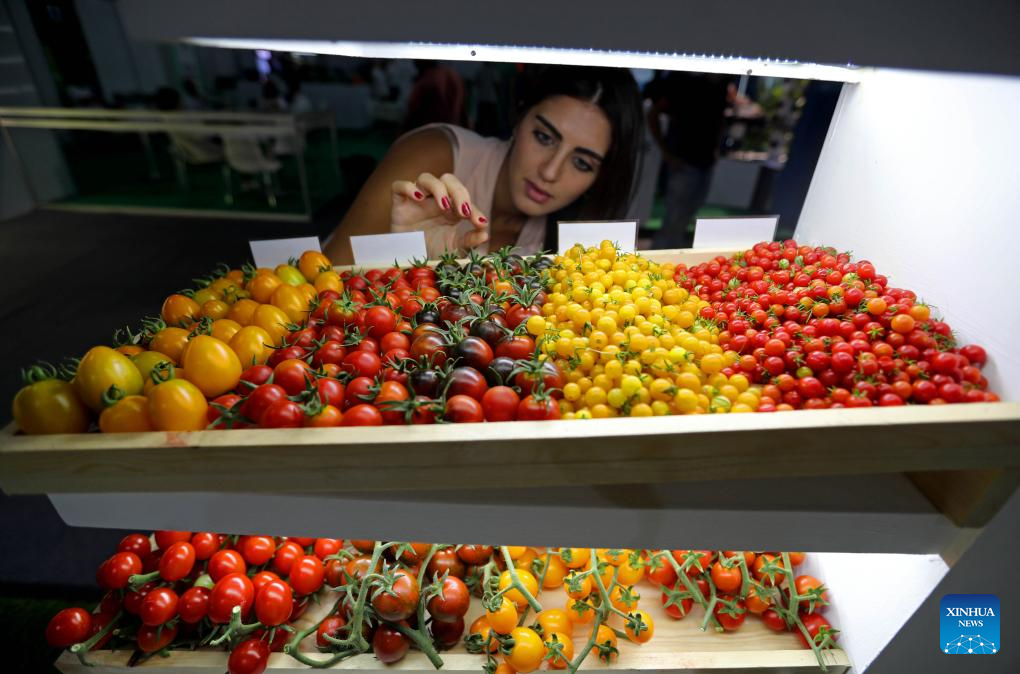 A woman views cherry tomatoes displayed at the Agri Lebanon Expo in Beirut, Lebanon, on Sept. 10, 2025. The event, held from Sept. 10 to 12, brings together farmers, agribusinesses, technology providers, and policymakers to showcase the latest innovations, foster sustainable practices, and drive economic growth across the agrifood sector. (Xinhua/Bilal Jawich)