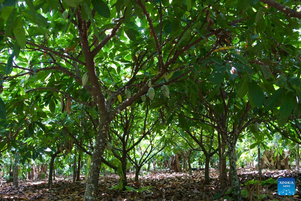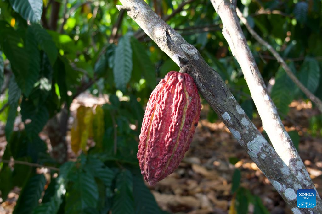 This photo taken on Sept. 10, 2025 shows the agroforestry system at an agroforestry cocoa orchard in Medicilandia, Para state, Brazil. Located in northern Brazil, the state of Para is the largest cocoa-producing area in Brazil, with annual yields of approximately 150,000 tons of cocoa beans, 95 percent of which are exported. To restore degraded lands and enhance farmers' income, the Nature Conservancy (TNC) in Brazil encourages farmers to adopt agroforestry systems, integrating cocoa cultivation with other tree species to rehabilitate degraded or low-productivity areas. This agroforestry approach also enables rural producers to diversify their income by growing fruit trees and other native species, contributing to a sustainable agricultural model. (Xinhua/Zhou Yongsui)