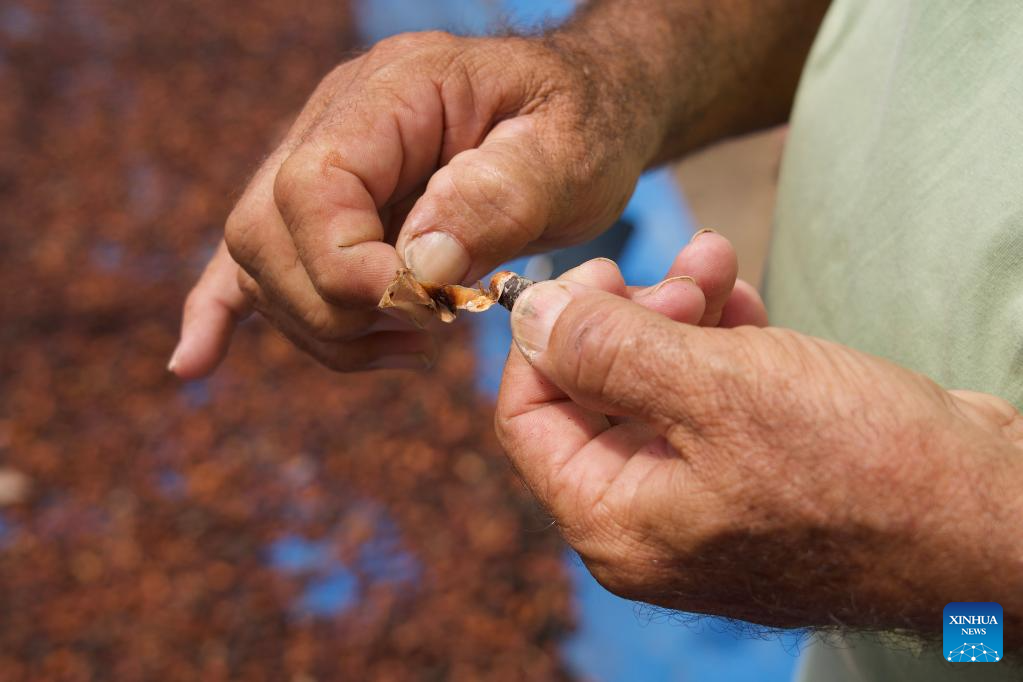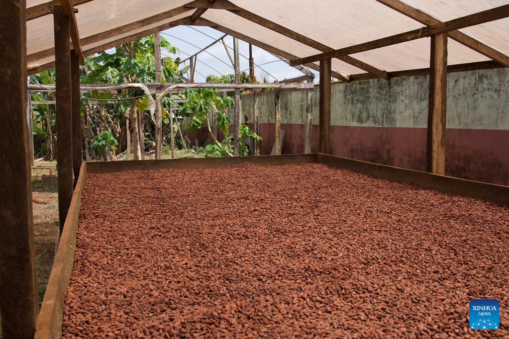 Cocoa beans are sun-dried at a chocolate factory in Medicilandia, Para state, Brazil, on Sept. 10, 2025. Located in northern Brazil, the state of Para is the largest cocoa-producing area in Brazil, with annual yields of approximately 150,000 tons of cocoa beans, 95 percent of which are exported. To restore degraded lands and enhance farmers' income, the Nature Conservancy (TNC) in Brazil encourages farmers to adopt agroforestry systems, integrating cocoa cultivation with other tree species to rehabilitate degraded or low-productivity areas. This agroforestry approach also enables rural producers to diversify their income by growing fruit trees and other native species, contributing to a sustainable agricultural model. (Xinhua/Zhou Yongsui)