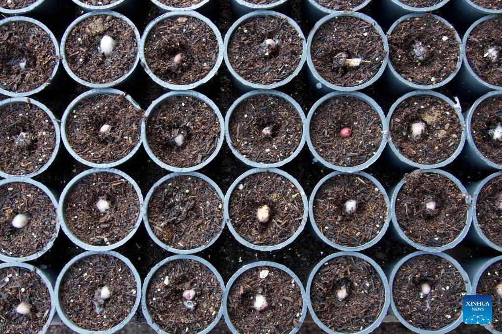 A farmer plants cocoa tree seeds at a cocoa tree nursery in Brasil Novo, Para state, Brazil, on Sept. 9, 2025. Located in northern Brazil, the state of Para is the largest cocoa-producing area in Brazil, with annual yields of approximately 150,000 tons of cocoa beans, 95 percent of which are exported. To restore degraded lands and enhance farmers' income, the Nature Conservancy (TNC) in Brazil encourages farmers to adopt agroforestry systems, integrating cocoa cultivation with other tree species to rehabilitate degraded or low-productivity areas. This agroforestry approach also enables rural producers to diversify their income by growing fruit trees and other native species, contributing to a sustainable agricultural model. (Xinhua/Zhou Yongsui)