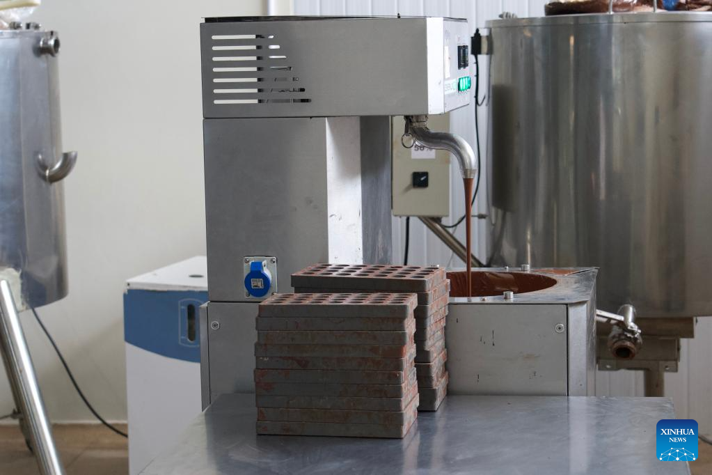 A machine produces cocoa liquor at a chocolate factory in Medicilandia, Para state, Brazil, on Sept. 10, 2025. Located in northern Brazil, the state of Para is the largest cocoa-producing area in Brazil, with annual yields of approximately 150,000 tons of cocoa beans, 95 percent of which are exported. To restore degraded lands and enhance farmers' income, the Nature Conservancy (TNC) in Brazil encourages farmers to adopt agroforestry systems, integrating cocoa cultivation with other tree species to rehabilitate degraded or low-productivity areas. This agroforestry approach also enables rural producers to diversify their income by growing fruit trees and other native species, contributing to a sustainable agricultural model. (Xinhua/Zhou Yongsui)