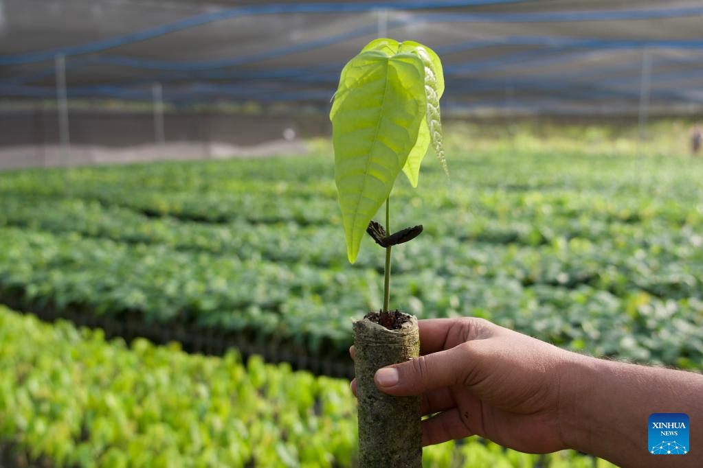 This photo taken on Sept. 9, 2025 shows a view of a cocoa tree nursery in Brasil Novo, Para state, Brazil. Located in northern Brazil, the state of Para is the largest cocoa-producing area in Brazil, with annual yields of approximately 150,000 tons of cocoa beans, 95 percent of which are exported. To restore degraded lands and enhance farmers' income, the Nature Conservancy (TNC) in Brazil encourages farmers to adopt agroforestry systems, integrating cocoa cultivation with other tree species to rehabilitate degraded or low-productivity areas. This agroforestry approach also enables rural producers to diversify their income by growing fruit trees and other native species, contributing to a sustainable agricultural model. (Xinhua/Zhou Yongsui)