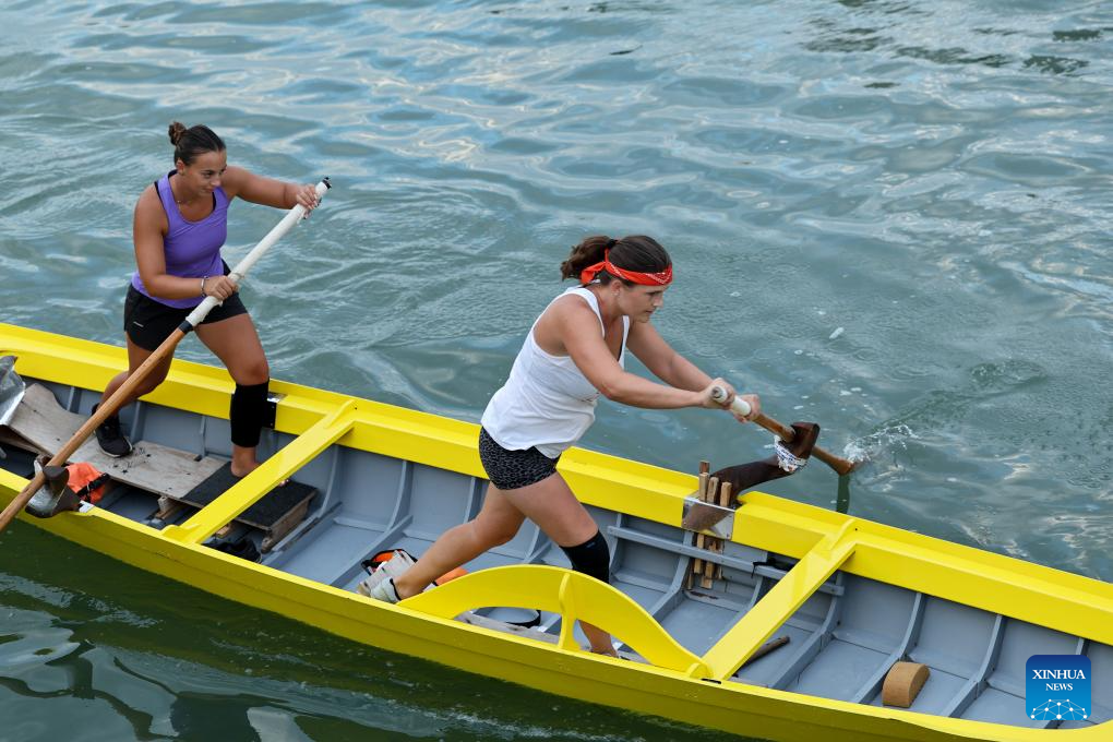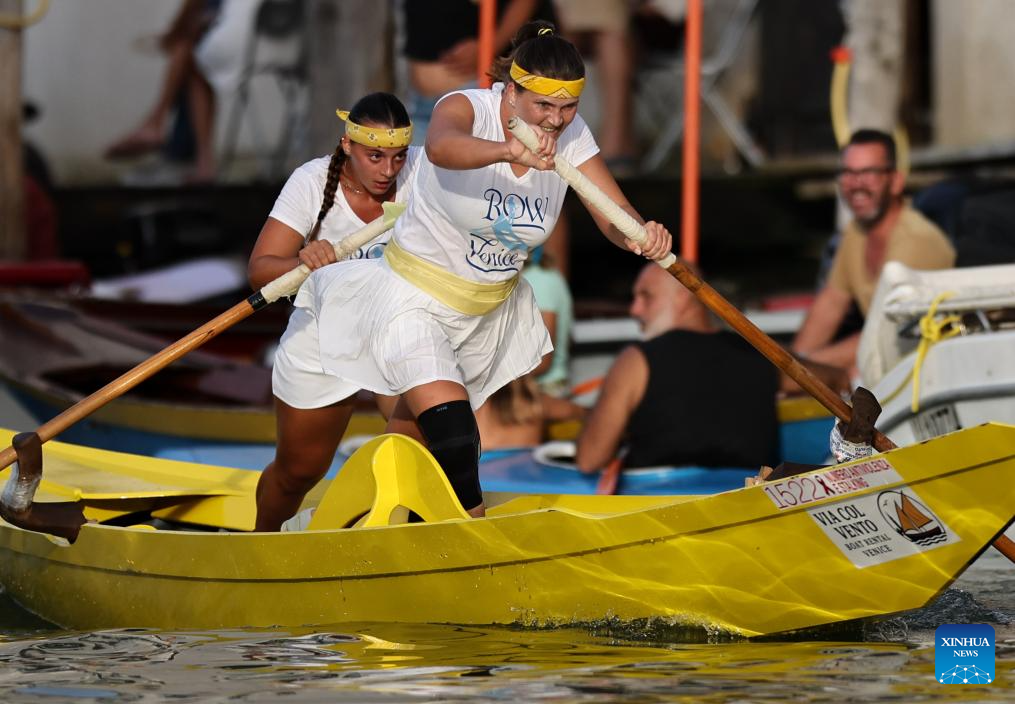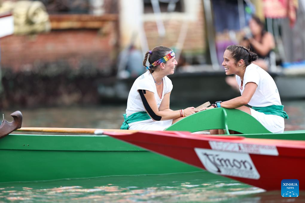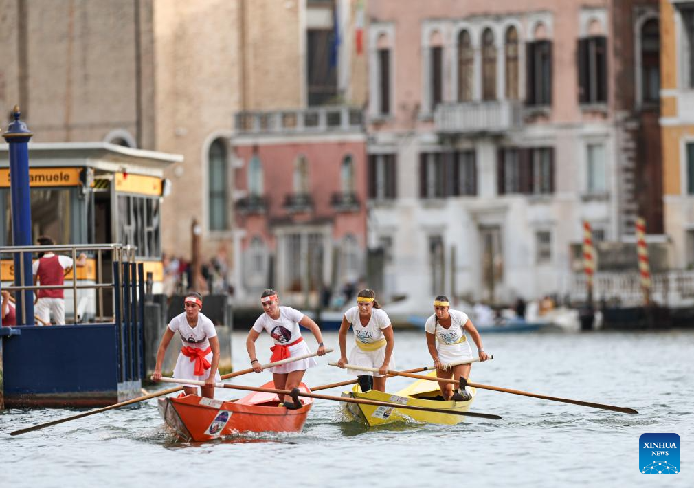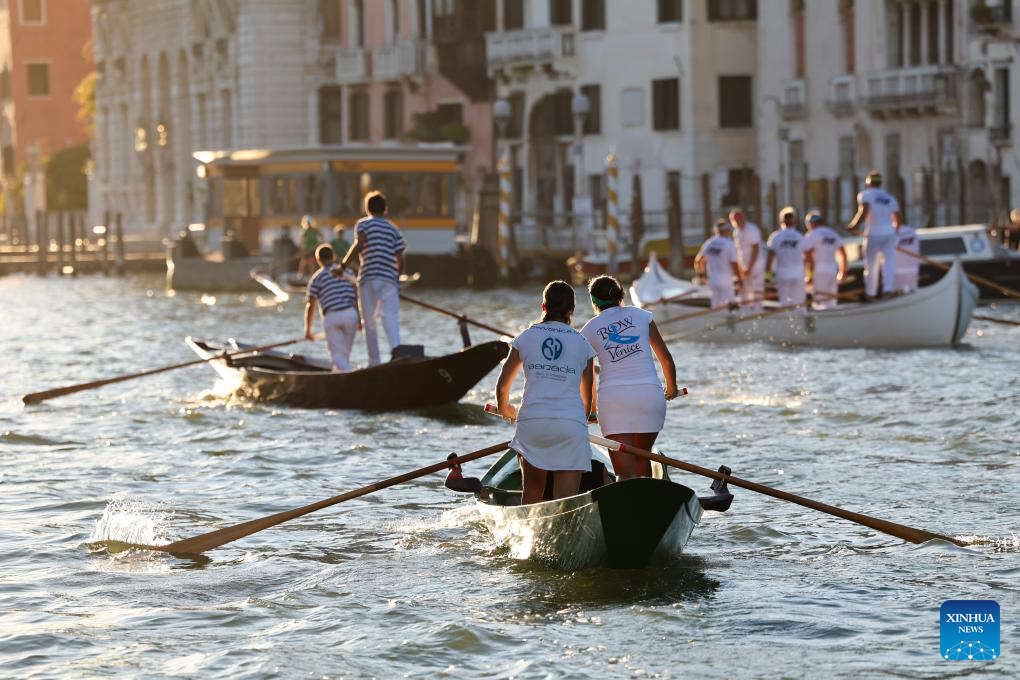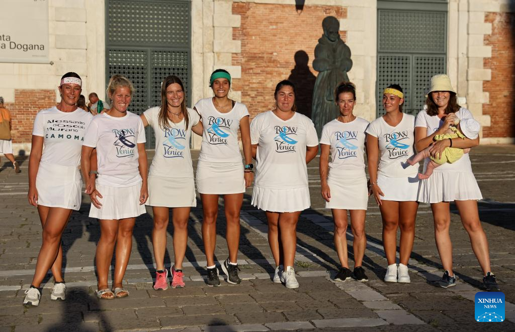 Members of "Row Venice" attend a rehearsal of the Regata Storica boat race in Venice, Italy, Sept. 4, 2025.(Xinhua/Li Jing)