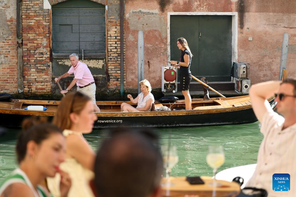Elena Almansi (R, back), member of "Row Venice," gives a lesson of rowing for tourists in Venice, Italy, Aug. 31, 2025.(Xinhua/Li Jing)