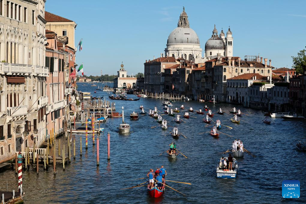 Rowers compete during the Regata Storica boat race in Venice, Italy, Sept. 7, 2025.(Xinhua/Li Jing)