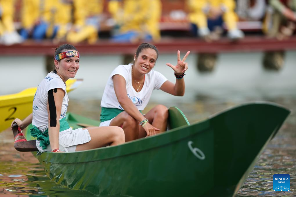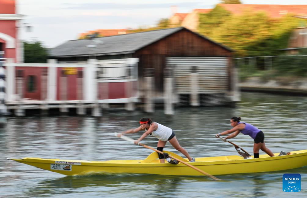 Female rowers practice before the Regata Storica boat race in Venice, Italy, Sept. 4, 2025.(Xinhua/Li Jing)