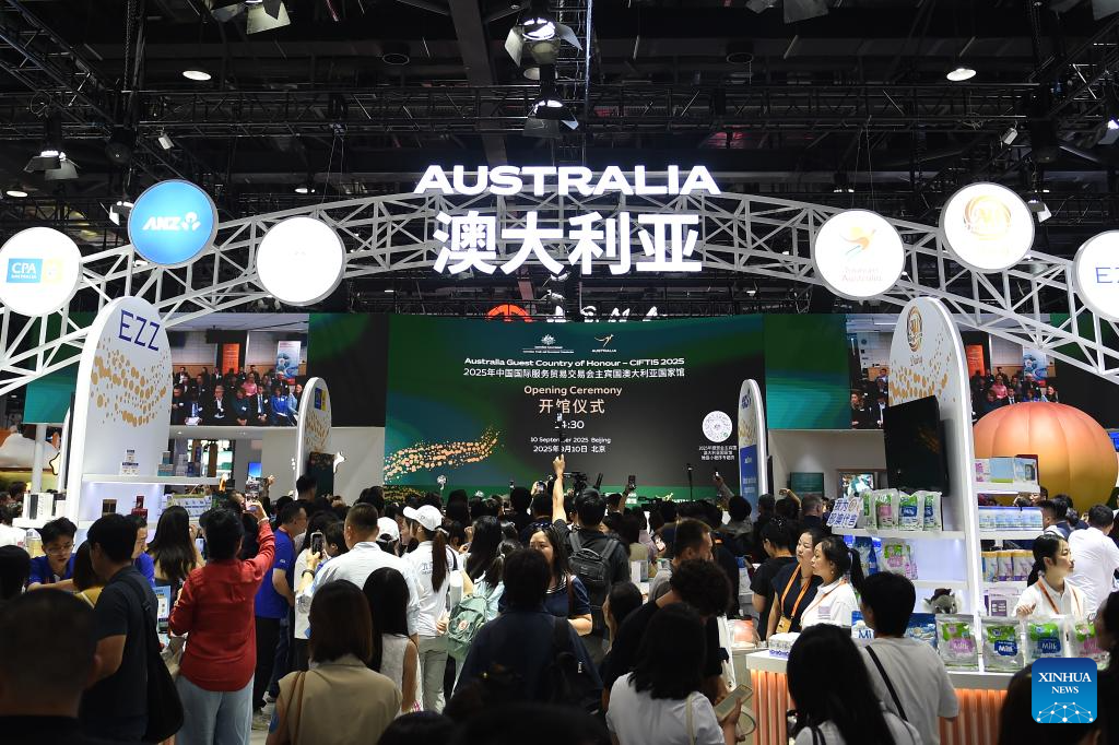 People attend the opening of the pavilion of Australia, the Guest Country of Honor at the 2025 China International Fair for Trade in Services (CIFTIS), in Beijing, capital of China, Sept. 10, 2025. The 2025 CIFTIS opened in Beijing on Wednesday, themed "Embrace Intelligent Technologies, Empower Trade in Services." (Xinhua/Liu Lingyi)