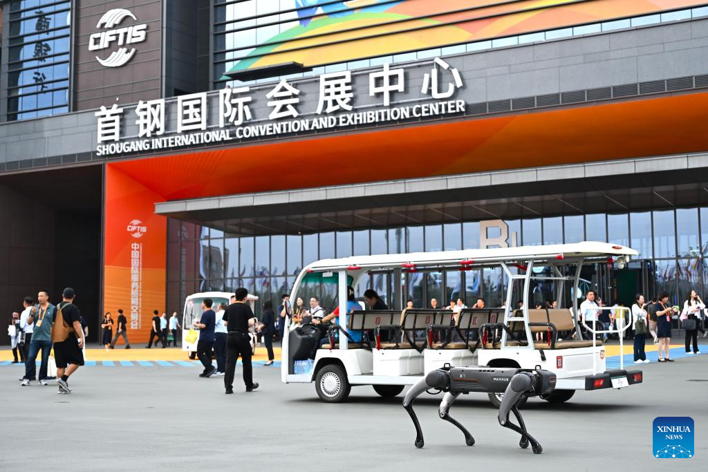 A robot dog is pictured at the venue for the 2025 China International Fair for Trade in Services (CIFTIS) in Beijing, capital of China, Sept. 10, 2025. The 2025 CIFTIS opened in Beijing on Wednesday, themed "Embrace Intelligent Technologies, Empower Trade in Services." (Xinhua/Sui Shangjun)
