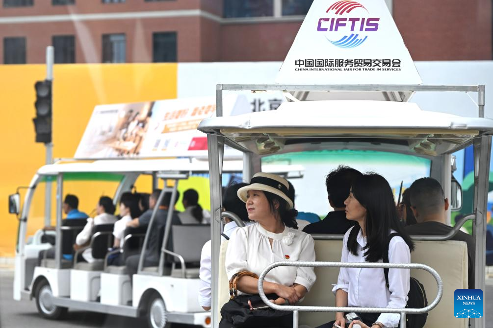 Visitors take a shuttle vehicle to visit the 2025 China International Fair for Trade in Services (CIFTIS) in Beijing, capital of China, Sept. 10, 2025. The 2025 CIFTIS opened in Beijing on Wednesday, themed "Embrace Intelligent Technologies, Empower Trade in Services." (Xinhua/Sui Shangjun)