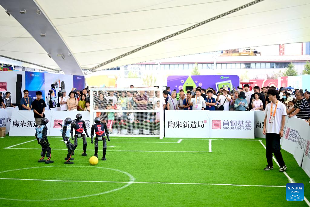 People watch a football match by robotic players at the Sports Services thematic exhibition area of the 2025 China International Fair for Trade in Services (CIFTIS) at Shougang Park in Beijing, capital of China, Sept. 13, 2025. The 2025 CIFTIS opens to the general public from Sept. 13 to 14. Visitors with reservation can access the fair free of charge. (Xinhua/Chen Yehua)