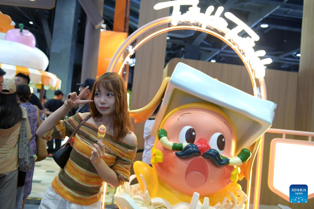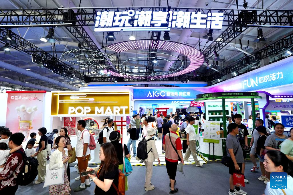 A visitor poses for photos at the booth of Pop Mart at the 2025 China International Fair for Trade in Services (CIFTIS) at Shougang Park in Beijing, capital of China, Sept. 13, 2025. The 2025 CIFTIS opens to the general public from Sept. 13 to 14. Visitors with reservation can access the fair free of charge. (Xinhua/Zhang Xinjing)