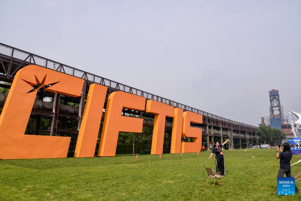 A staff member poses for photos with a logo of the 2025 China International Fair for Trade in Services (CIFTIS) at Shougang Park in Beijing, capital of China, Sept. 13, 2025. The 2025 CIFTIS opens to the general public from Sept. 13 to 14. Visitors with reservation can access the fair free of charge. (Xinhua/Xu Qin)