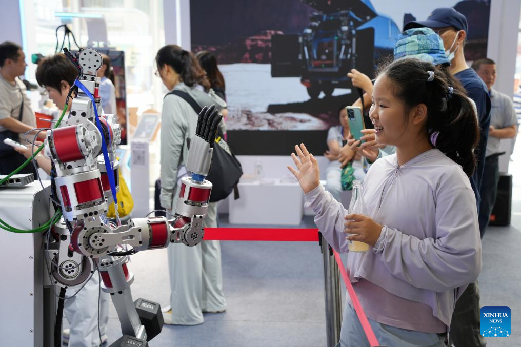 A girl interacts with a robot during the 2025 China International Fair for Trade in Services (CIFTIS) at Shougang Park in Beijing, capital of China, Sept. 13, 2025. The 2025 CIFTIS opens to the general public from Sept. 13 to 14. Visitors with reservation can access the fair free of charge. (Xinhua/Zhou Tinglu)