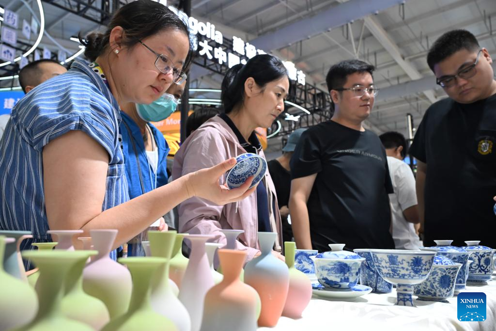 Visitors learn about porcelain artworks from Jingdezhen of Jiangxi Province at the 2025 China International Fair for Trade in Services (CIFTIS) at Shougang Park in Beijing, capital of China, Sept. 13, 2025. The 2025 CIFTIS opens to the general public from Sept. 13 to 14. Visitors with reservation can access the fair free of charge. (Xinhua/Sui Shangjun)