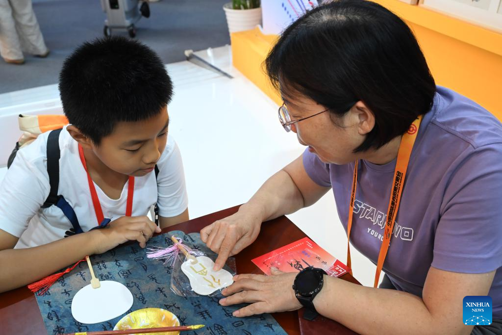 A boy learns about the oracle bone script characters at the 2025 China International Fair for Trade in Services (CIFTIS) at Shougang Park in Beijing, capital of China, Sept. 13, 2025. The 2025 CIFTIS opens to the general public from Sept. 13 to 14. Visitors with reservation can access the fair free of charge. (Xinhua/Sui Shangjun)