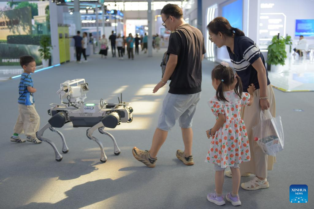 A child interacts with a robot dog at the 2025 China International Fair for Trade in Services (CIFTIS) at Shougang Park in Beijing, capital of China, Sept. 13, 2025. The 2025 CIFTIS opens to the general public from Sept. 13 to 14. Visitors with reservation can access the fair free of charge. (Xinhua/Zhang Xinjing)