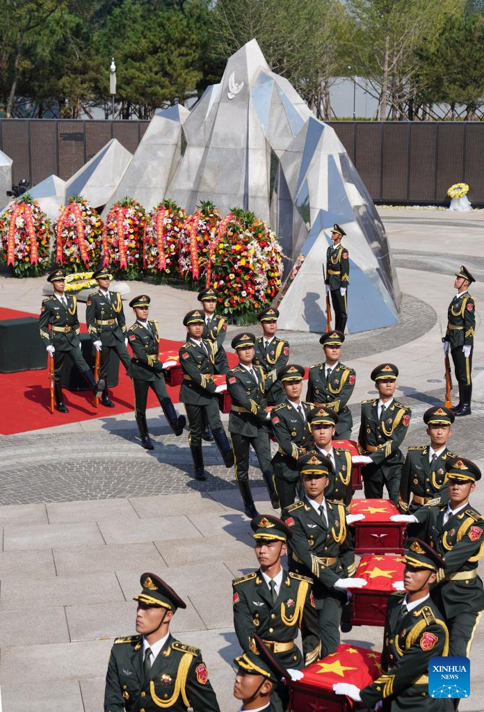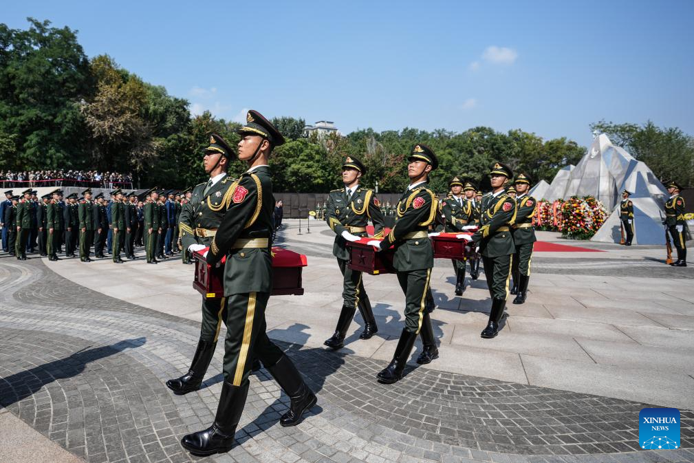 Guard of honor escort the caskets containing the remains of Chinese People's Volunteers (CPV) martyrs during a burial ceremony at the CPV martyrs' cemetery in Shenyang, northeast China's Liaoning Province, Sept. 13, 2025. The remains of 30 Chinese People's Volunteers (CPV) soldiers who lost their lives during the War to Resist U.S. Aggression and Aid Korea (1950-1953) were laid to rest on Saturday in Shenyang, capital of northeast China's Liaoning Province.