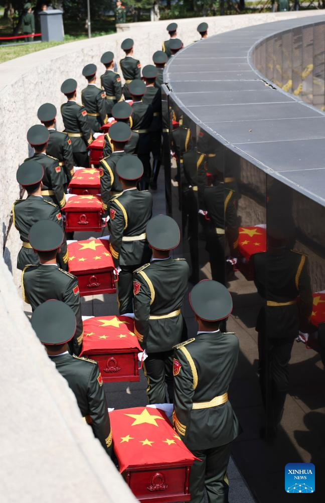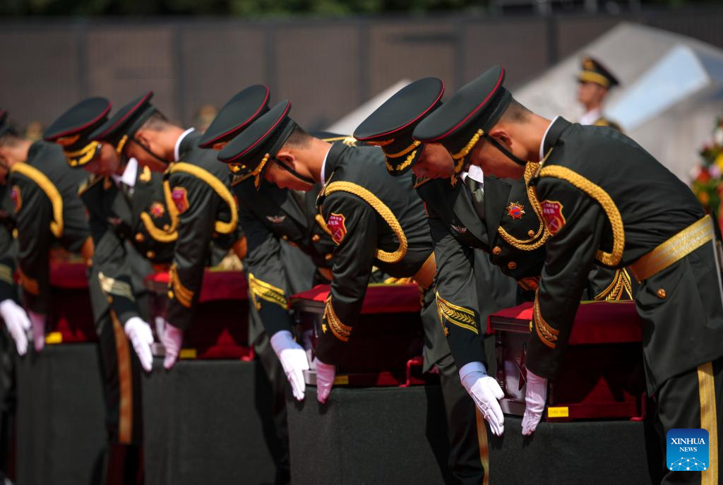 The caskets were draped with the Five-star Red Flag, and participants bowed three times in solemn silence to honor the soldiers' remains.
