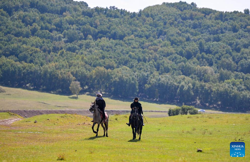 Tourists ride horses on the Ulan Butong grassland in Hexigten Banner of Chifeng, north China's Inner Mongolia Autonomous Region, Sept. 12, 2025. (Xinhua/Peng Yuan)