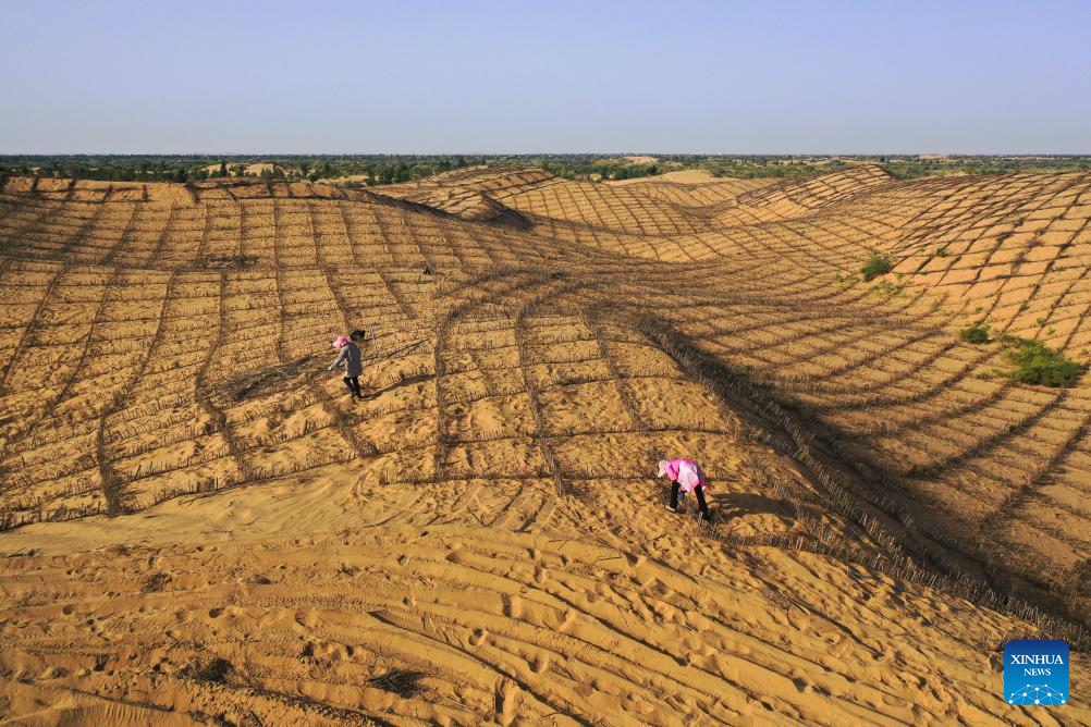 A worker lays sand barriers in Kubuqi Desert in Hangjin Banner, north China's Inner Mongolia Autonomous Region, Sept. 12, 2025. In recent years, Hangjin Banner has been steadily advancing the prevention and control of desertification, implementing projects such as the construction of forest and grassland belts around desert borders, blocking belts across sandstorm paths, as well as photovoltaic belts for sand control purpose, all of which have substantially improved the ecological environment of the Kubuqi Desert. (Xinhua/Li Zhipeng)