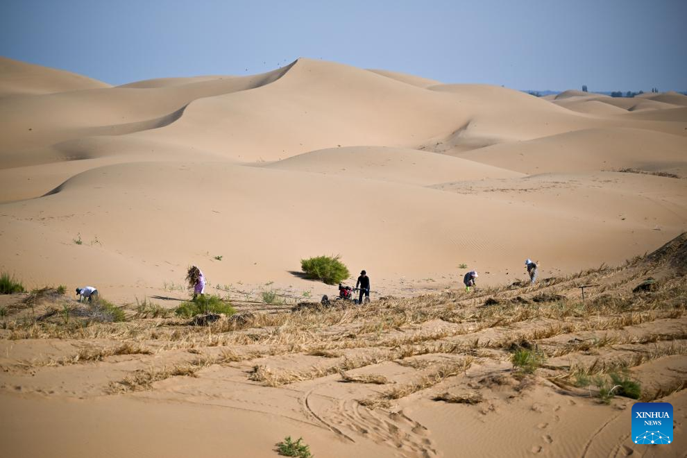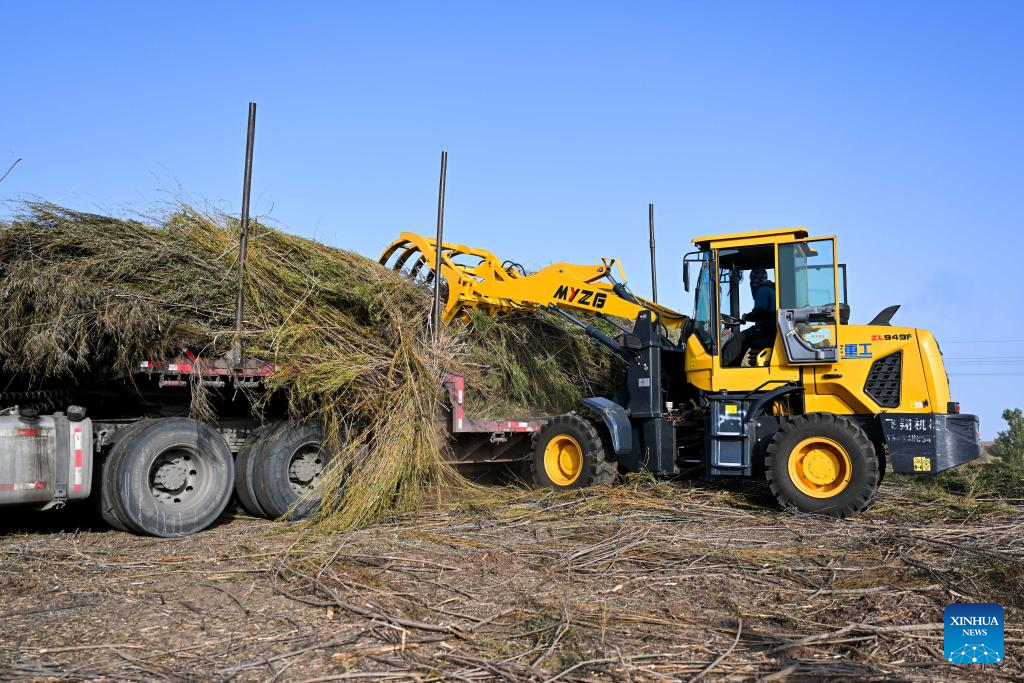 A worker unloads Mongolian willows (salix mongolica) at Kubuqi Desert in Hangjin Banner, north China's Inner Mongolia Autonomous Region, Sept. 12, 2025. In recent years, Hangjin Banner has been steadily advancing the prevention and control of desertification, implementing projects such as the construction of forest and grassland belts around desert borders, blocking belts across sandstorm paths, as well as photovoltaic belts for sand control purpose, all of which have substantially improved the ecological environment of the Kubuqi Desert. (Xinhua/Li Zhipeng)