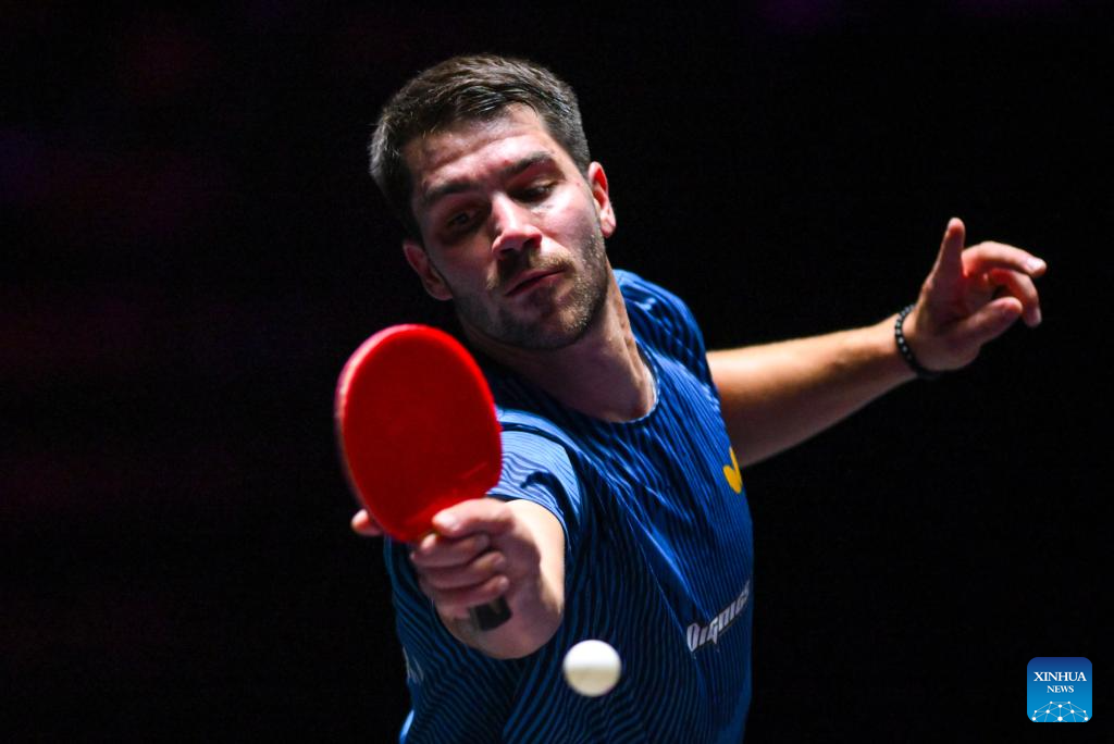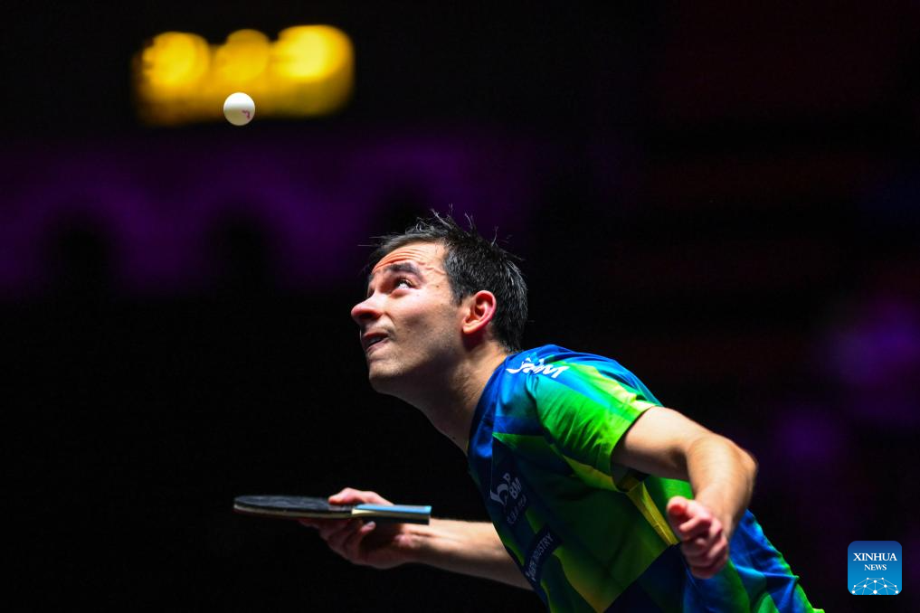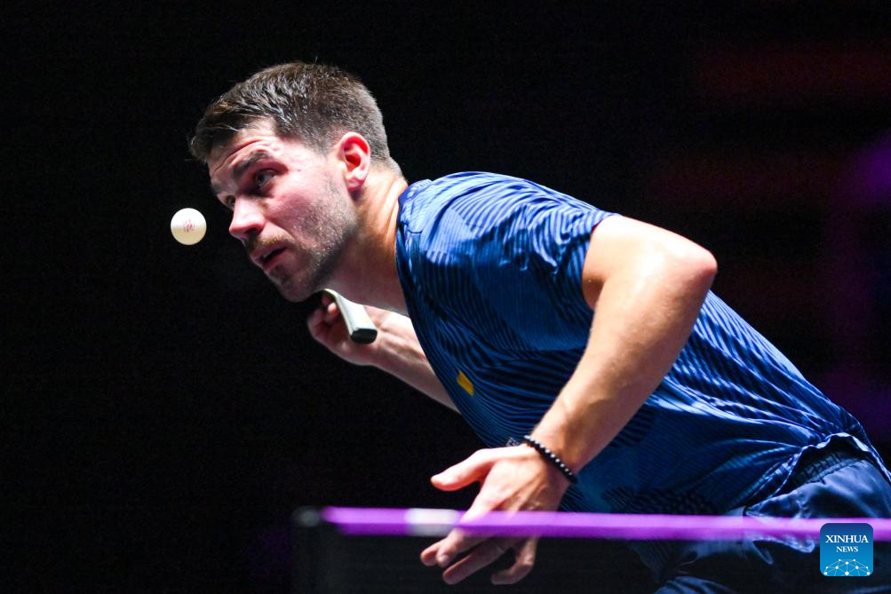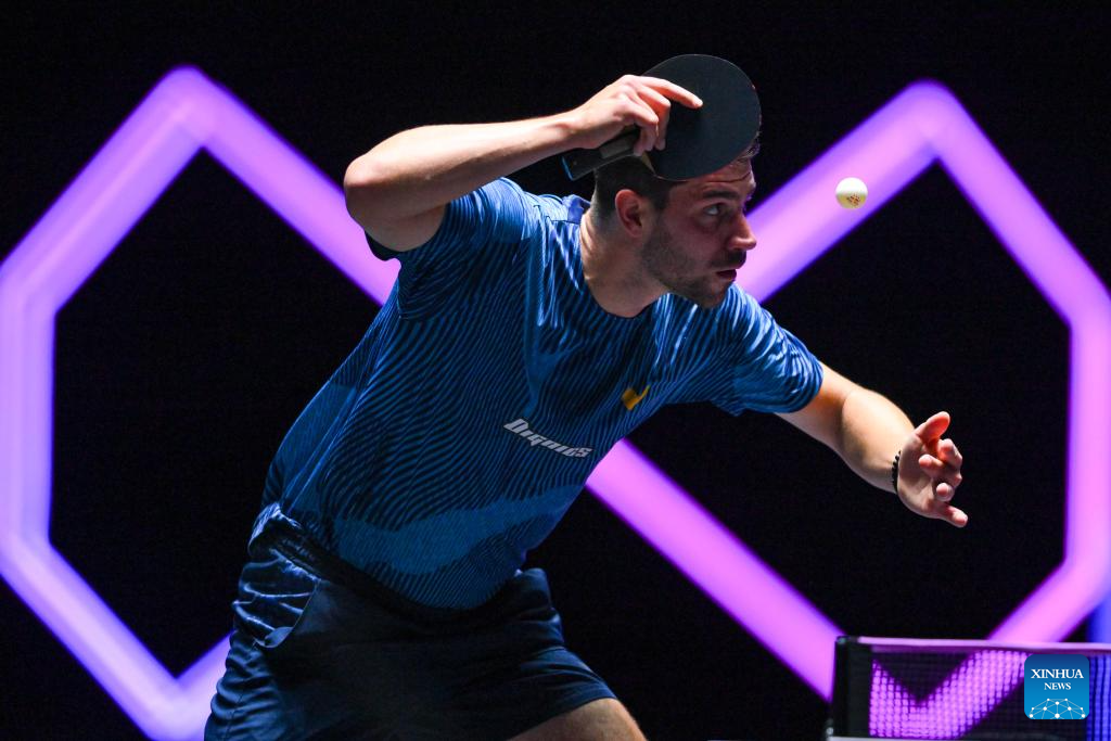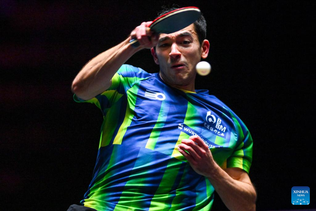 Patrick Franziska of Germany competes during the men's singles quarterfinal match against Hugo Calderano of Brazil at the 2025 World Table Tennis (WTT) Champions Macao in Macao, south China, Sept. 13, 2025. (Xinhua/Cheong Kam Ka)