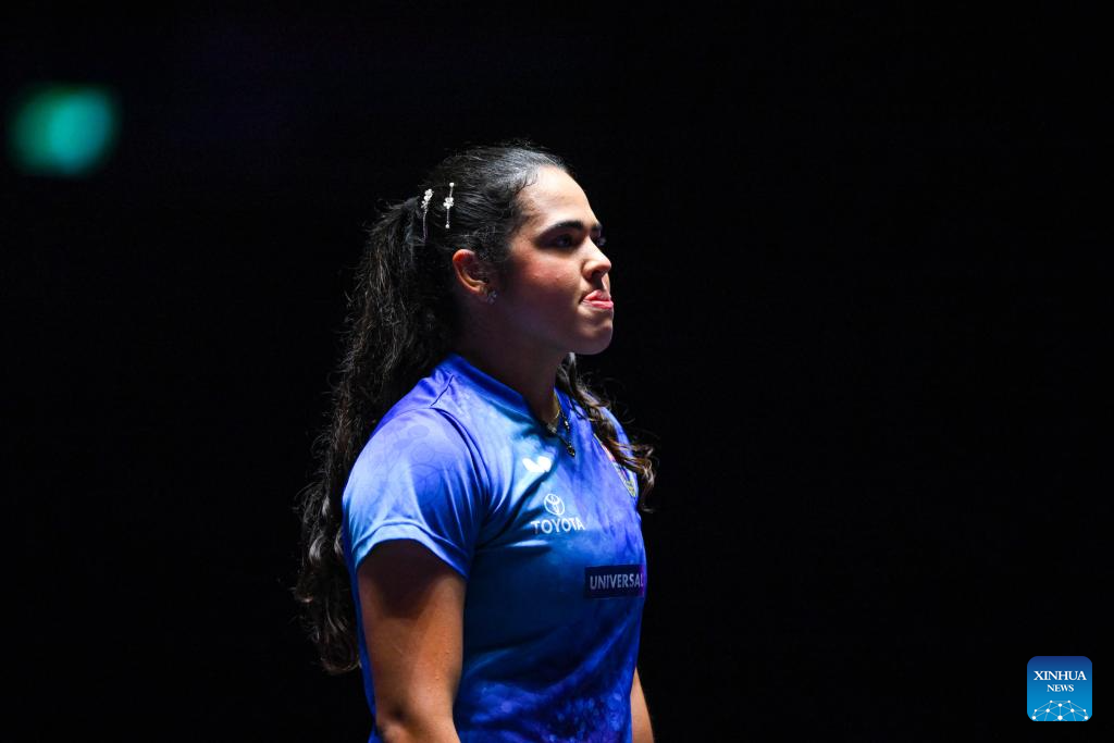 Adriana Diaz of Puerto Rico reacts during the women's singles quarterfinal match against Sun Yingsha of China at the 2025 World Table Tennis (WTT) Champions Macao in Macao, south China, Sept. 13, 2025. (Xinhua/Cheong Kam Ka)