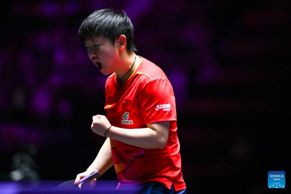 Sun Yingsha of China celebrates scoring during the women's singles quarterfinal match against Adriana Diaz of Puerto Rico at the 2025 World Table Tennis (WTT) Champions Macao in Macao, south China, Sept. 13, 2025. (Xinhua/Cheong Kam Ka)