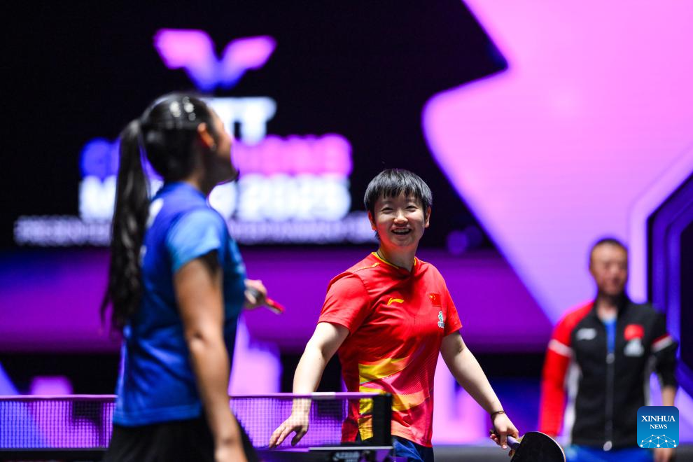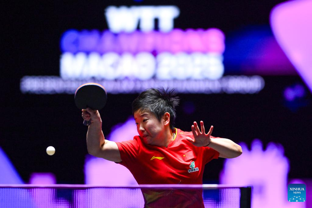 Sun Yingsha of China hits a return during the women's singles quarterfinal match against Adriana Diaz of Puerto Rico at the 2025 World Table Tennis (WTT) Champions Macao in Macao, south China, Sept. 13, 2025. (Xinhua/Cheong Kam Ka)