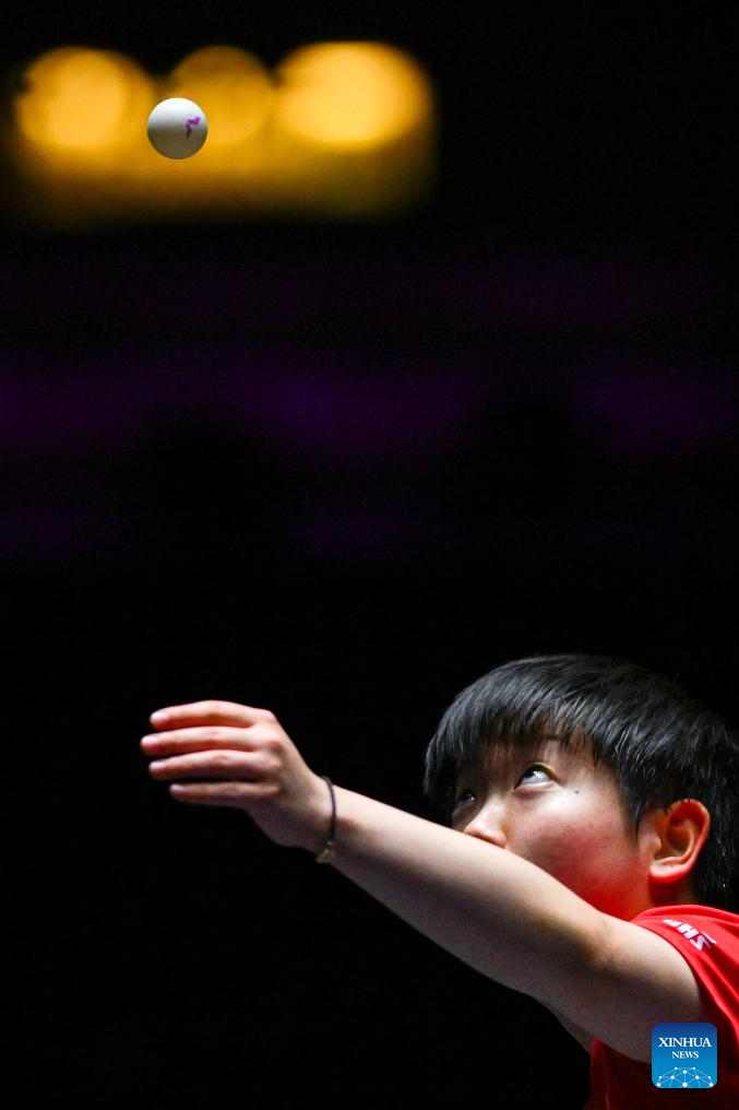 Sun Yingsha of China serves during the women's singles quarterfinal match against Adriana Diaz of Puerto Rico at the 2025 World Table Tennis (WTT) Champions Macao in Macao, south China, Sept. 13, 2025. (Xinhua/Cheong Kam Ka)