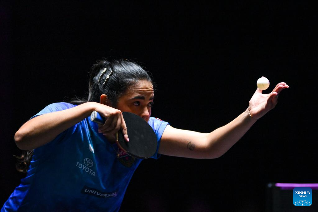 Adriana Diaz of Puerto Rico hits a return during the women's singles quarterfinal match against Sun Yingsha of China at the 2025 World Table Tennis (WTT) Champions Macao in Macao, south China, Sept. 13, 2025. (Xinhua/Cheong Kam Ka)