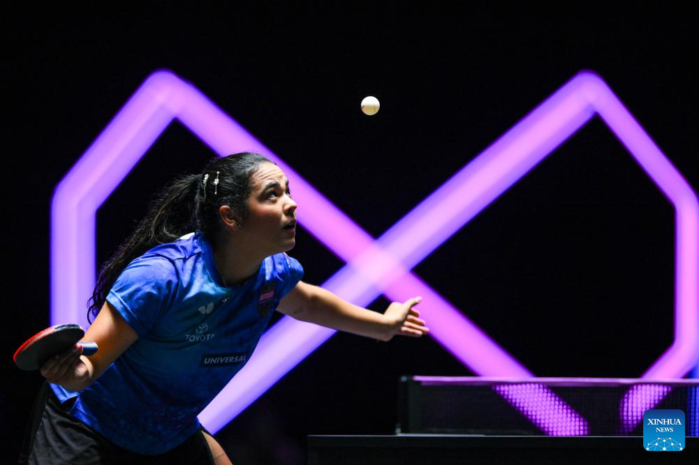 Adriana Diaz of Puerto Rico serves during the women's singles quarterfinal match against Sun Yingsha of China at the 2025 World Table Tennis (WTT) Champions Macao in Macao, south China, Sept. 13, 2025. (Xinhua/Cheong Kam Ka)