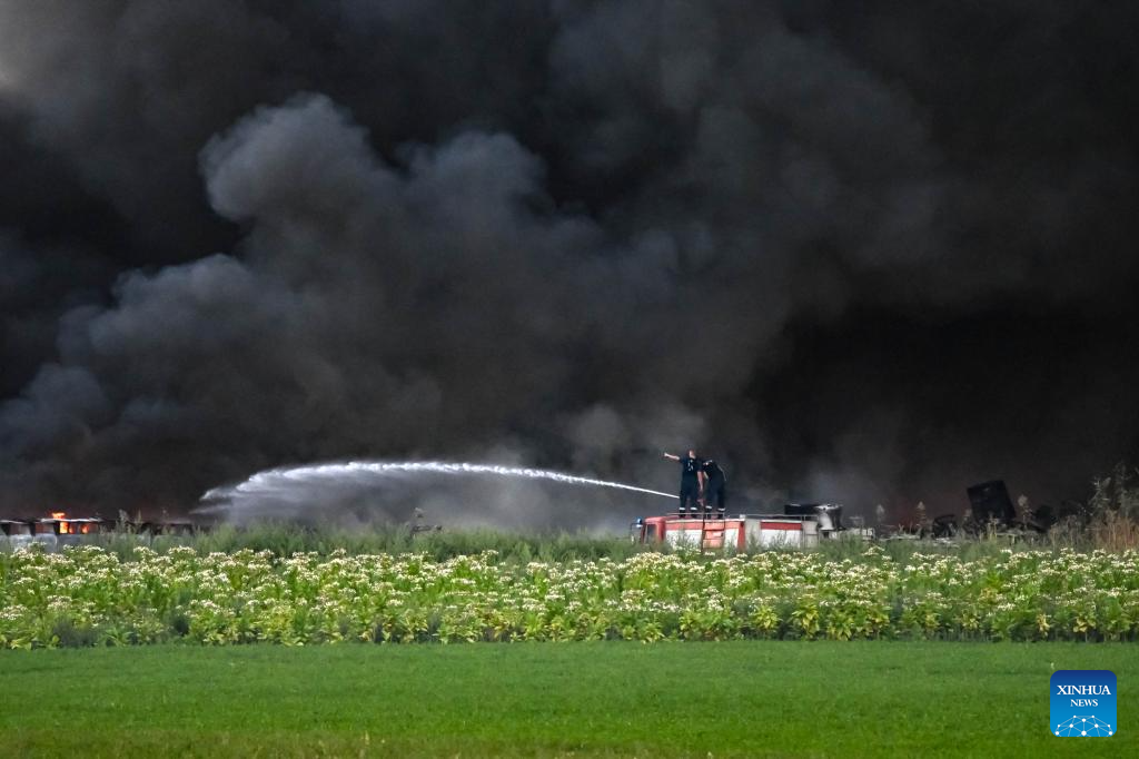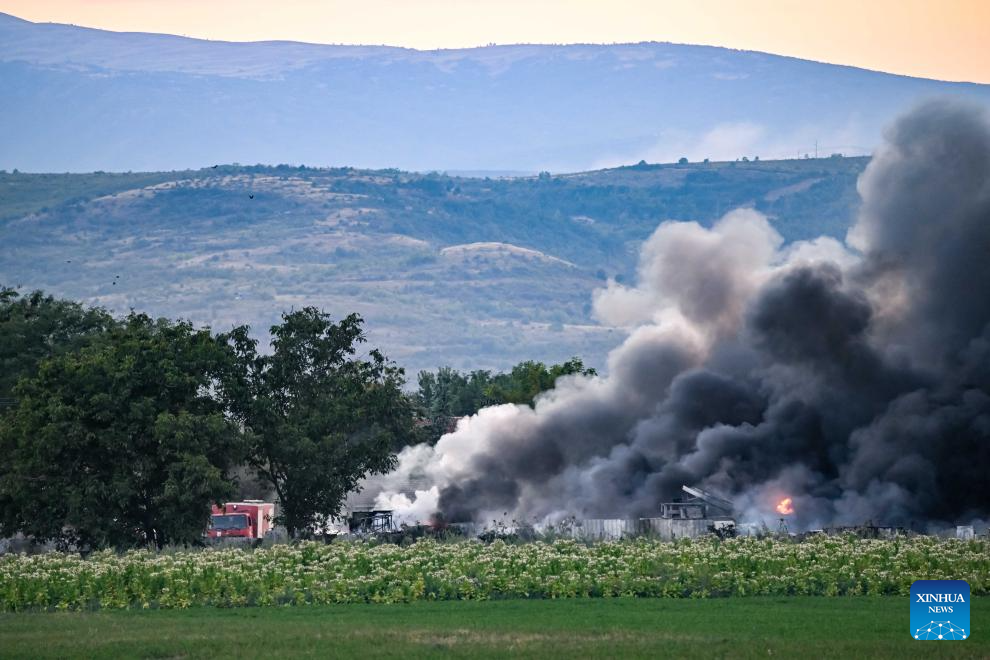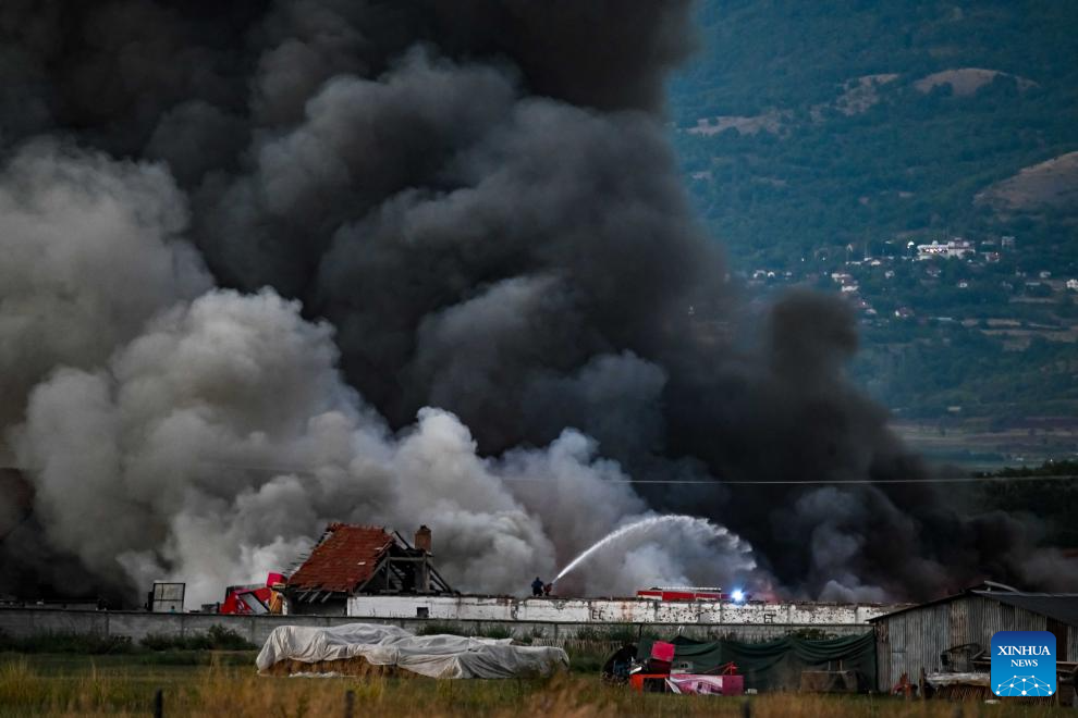 Black smoke rises from a huge fire at a "Zero Waste Skopje" facility for plastic materials in Skopje, North Macedonia, on Sept. 13, 2025. (Photo by Tomislav Georgiev/Xinhua)