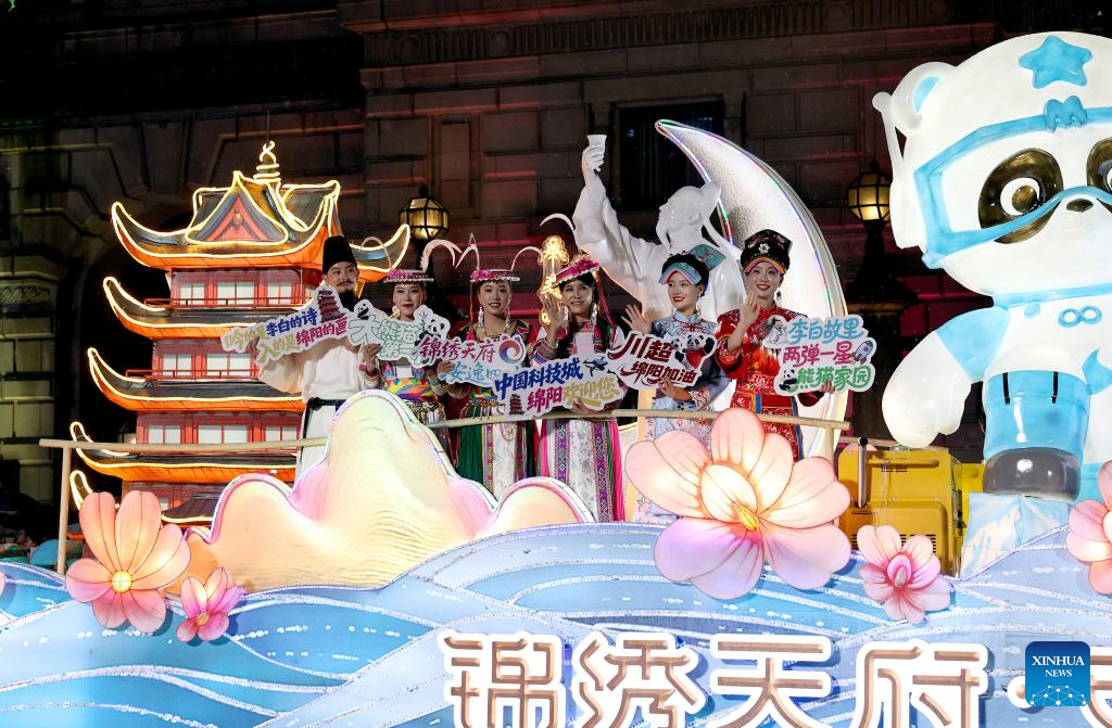 A theme float of Mianyang City of Sichuan Province takes part in a parade during the Shanghai Tourism Festival in Shanghai, east China, Sept. 13, 2025.