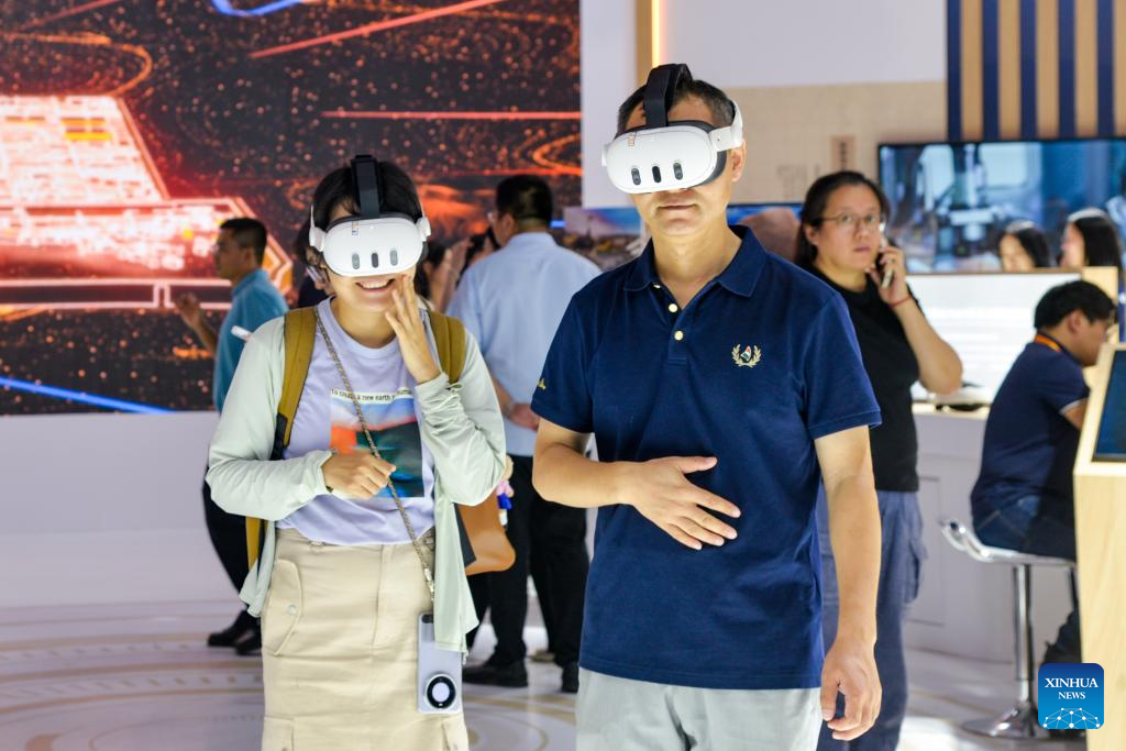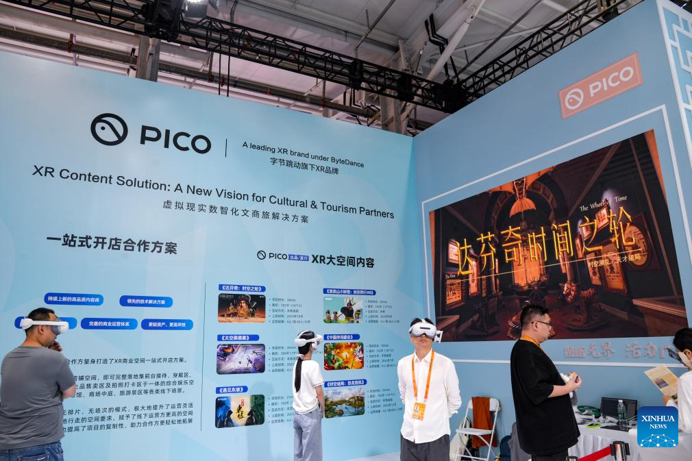 People learn about the XR Content Solution: A New Vision for Cultural & Tourism Partners at the Cultural & Tourism Services exhibition area of the 2025 China International Fair for Trade in Services (CIFTIS) at Shougang Park in Beijing, capital of China, Sept. 12, 2025. At the 2025 CIFTIS, a variety of cutting-edge technologies have enriched the exhibition, providing more interactive and immersing cultural and tourism experiences for visitors. (Xinhua/Xu Qin)