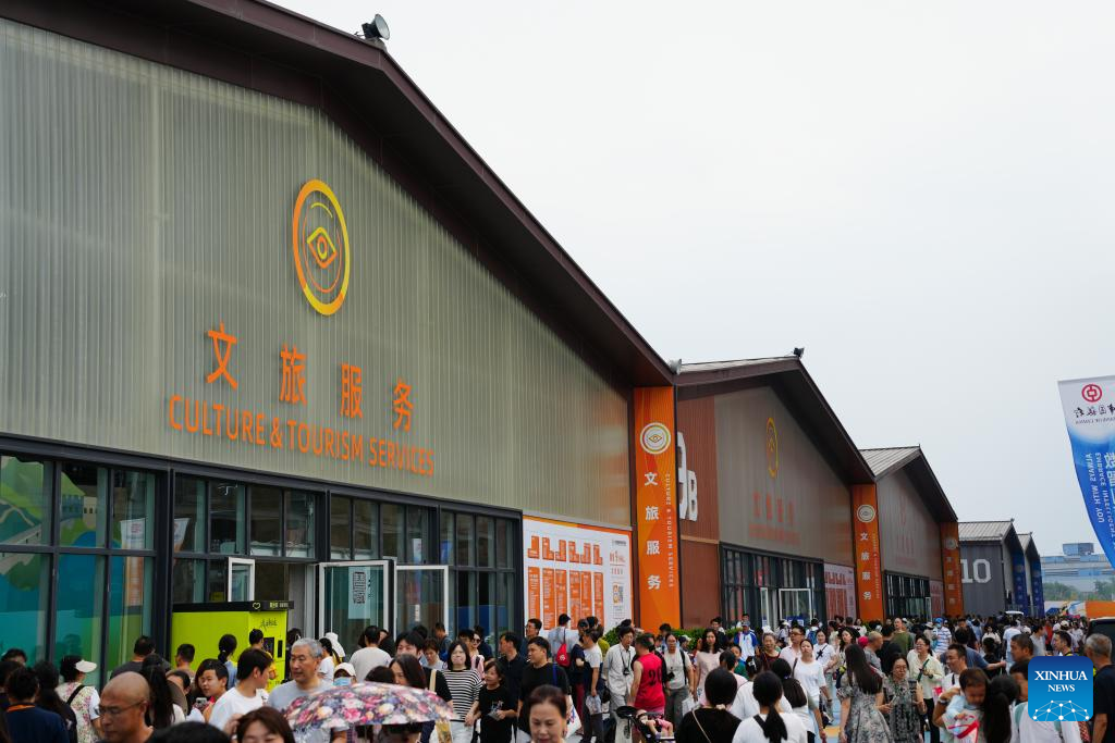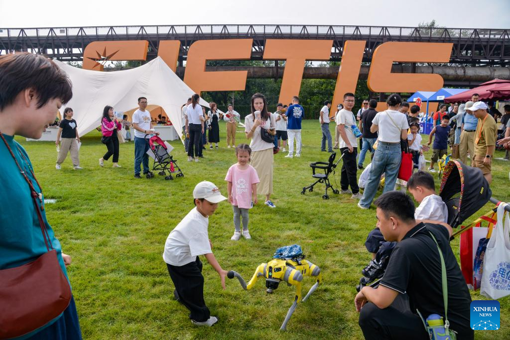 People visit the Cultural & Tourism Services exhibition area of the 2025 China International Fair for Trade in Services (CIFTIS) at Shougang Park in Beijing, capital of China, Sept. 13, 2025. At the 2025 CIFTIS, a variety of cutting-edge technologies have enriched the exhibition, providing more interactive and immersing cultural and tourism experiences for visitors. (Xinhua/Zhou Tinglu)