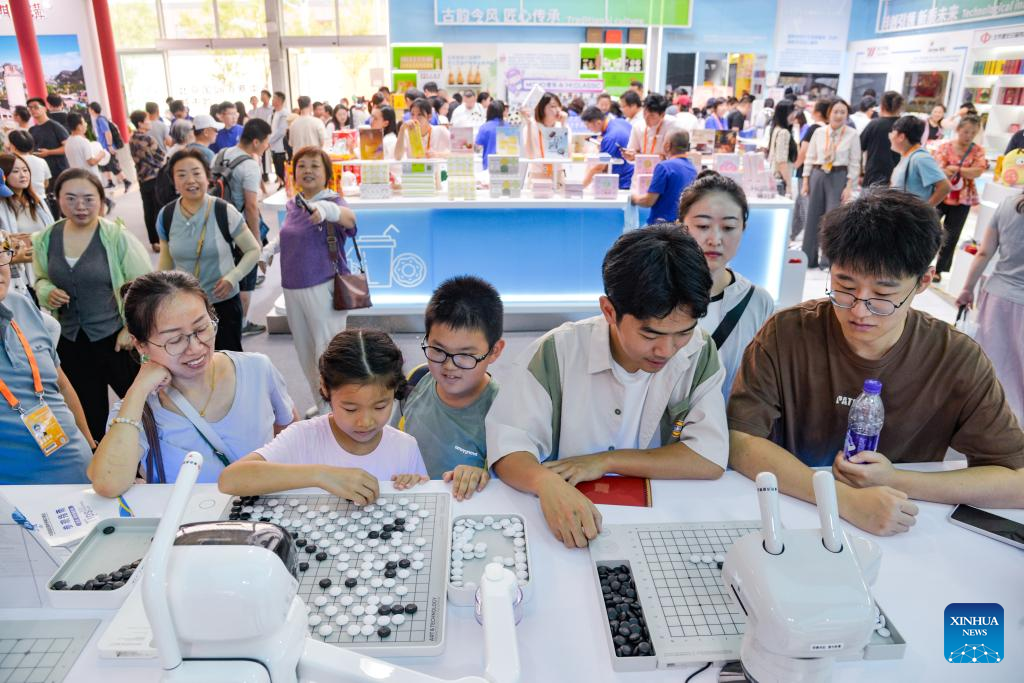 People play Go game, known as Weiqi in Chinese, with robots at the Cultural & Tourism Services exhibition area of the 2025 China International Fair for Trade in Services (CIFTIS) at Shougang Park in Beijing, capital of China, Sept. 13, 2025. At the 2025 CIFTIS, a variety of cutting-edge technologies have enriched the exhibition, providing more interactive and immersing cultural and tourism experiences for visitors. (Xinhua/Xu Qin)