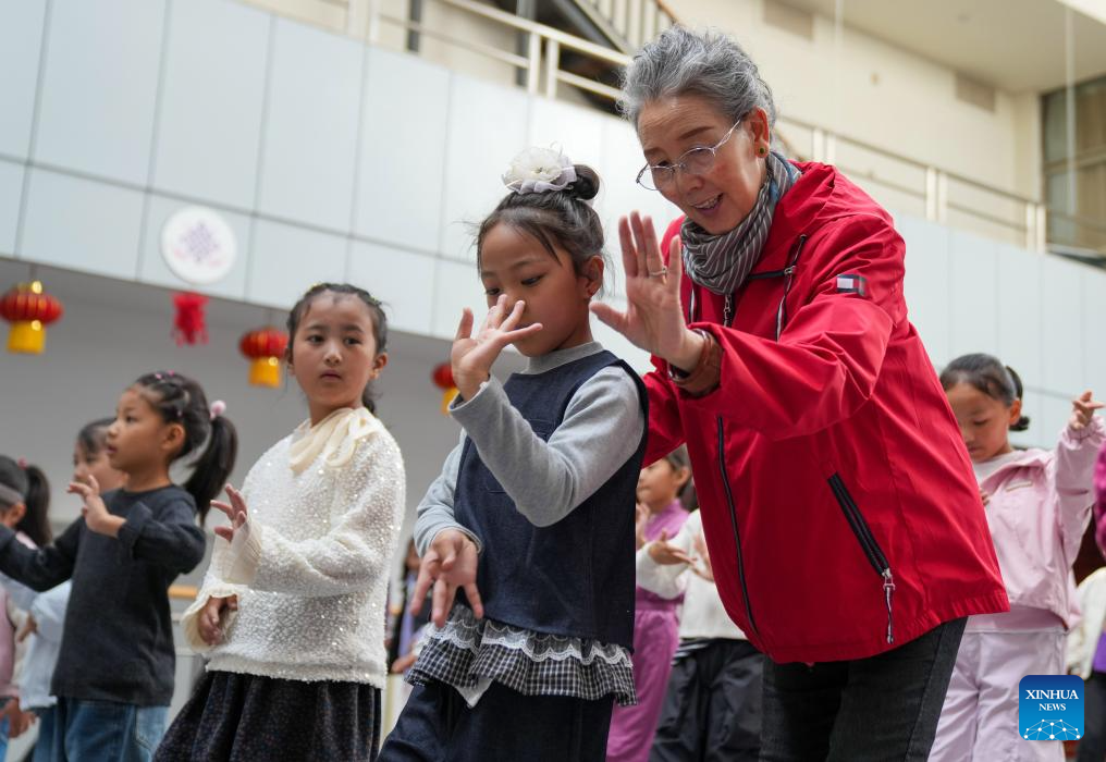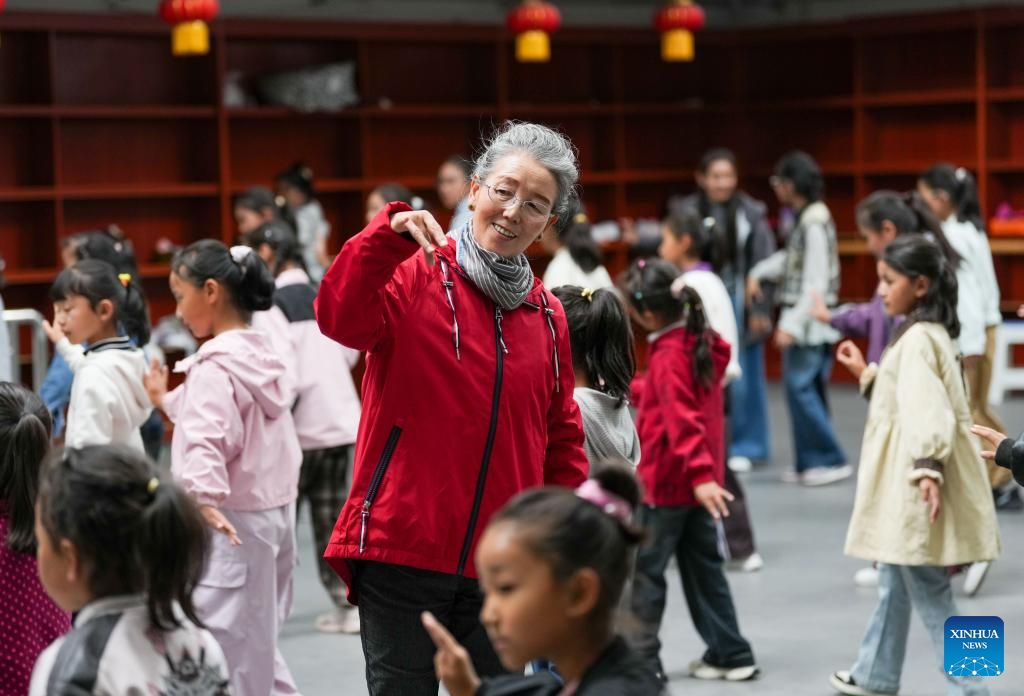 Pasang teaches children Tibetan opera at the public art center in Lhasa, southwest China's Xizang Autonomous Region, Sept. 14, 2025. Pasang, a national first-class performer and retired member of the Tibetan opera troupe of the Xizang Autonomous Region, has voluntarily devoted her weekends to teaching Tibetan opera to children for a decade.