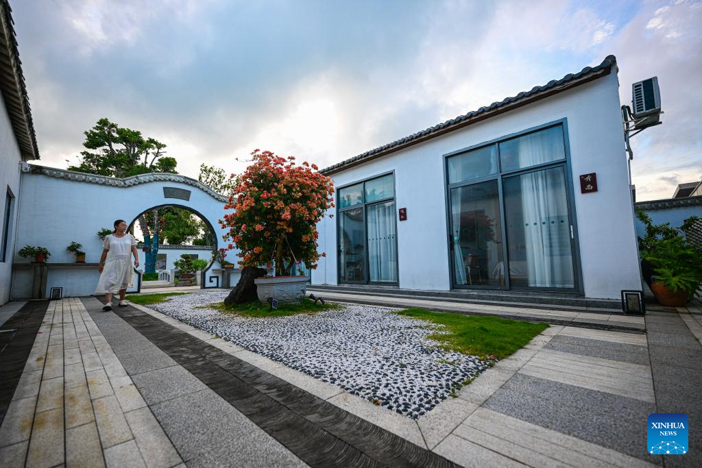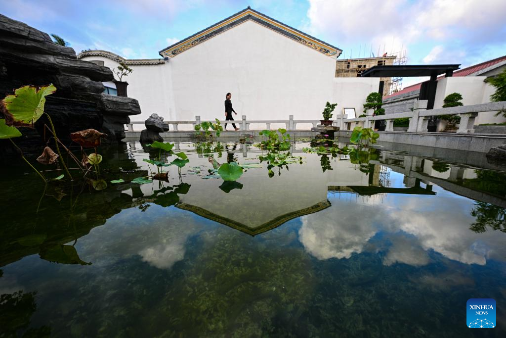 This photo taken on Sept. 9, 2025 shows a courtyard of a homestay in Jiamei Village, Wenchang City, south China's Hainan Province. In recent years, Jiamei Village of Hainan Province has been advancing its rural revitalization. The village has developed industries such as cultural tourism, yellow cattle farming, fruit and vegetable cultivation, and aquaculture drawing on its rich history, culture and natural resources. In 2023, Jiamei Village was listed in the sixth batch of traditional Chinese villages catalog. (Xinhua/Pu Xiaoxu)